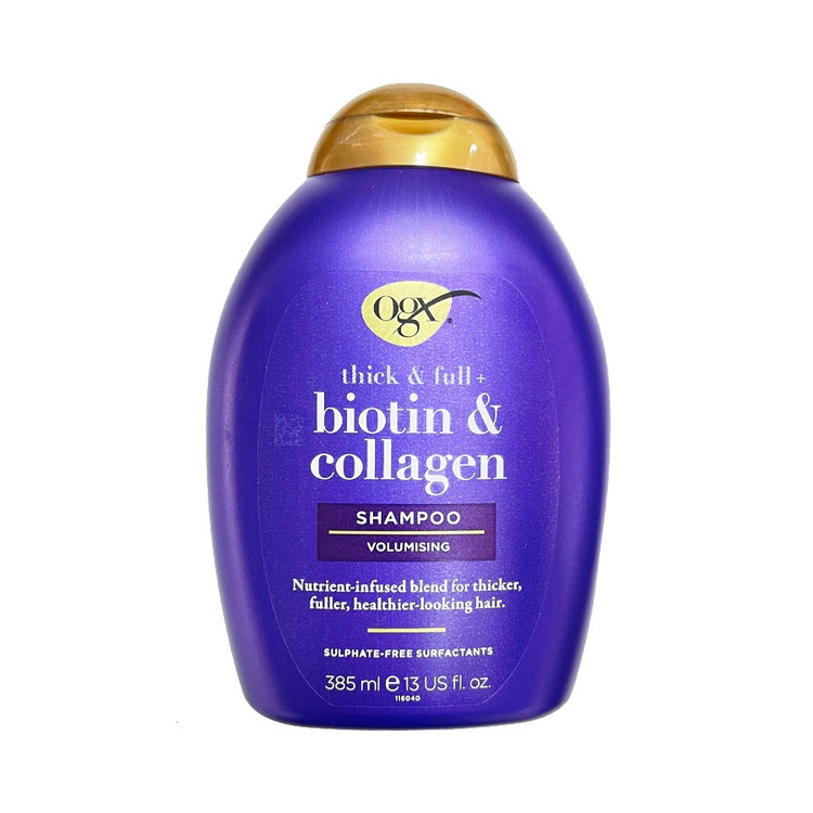 شامپو او جی ایکس بنفش یک شامپوی فوق العاده با کیفیت برای موهای کم حجم است که موجب ضخیم تر شدن و افزایش حجم تارهای مو میشود. مواد معدنی موجود در این شامپو موجب تقویت و تغذیه موها شده در نتیجه موها سالم تر و درخشان تر به نظر میرسد. شامپو بیوتین و کلاژن ogx تمام آلودگی و ناخالصیهای مو و کف سر را تمیز کرده و از بین میبرد و بلافاصله پس از استفاده ظاهری پرپشت به موها میدهد؛ همچنین با رایحه ترنج، یاس و وانیل موها را خوش بو میکند.