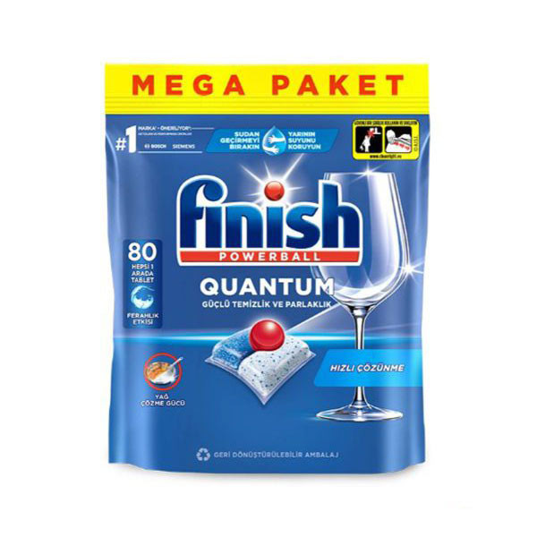 قرص فینیش کوانتوم 80 عددی، یک محصول با کارایی بالا است که با استفاده از فن آوری های نوین در زمینه شستشوی ظروف، طراحی شده است. این قرص حاوی سه عامل فعال است: نمک ظرفشویی، براق کننده ها و انواع مواد شوینده مختلف.نمک ظرفشویی: باعث جلوگیری از رسوبات سخت و لکه ها روی ظروف می شود. همچنین با تعادل بخشیدن به سختی آب، باعث حفظ کارآیی و عمر مفید ماشین ظرفشویی می شود.