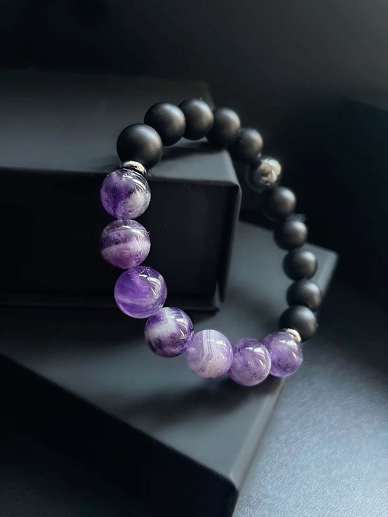 این دستبند زیبا و منحصر به فرد، ترکیبی از سنگهای آمیتیست و اونیکس مات به همراه حدید گرد و واشری نقرهای است، که نه تنها زیبایی خیرهکنندهای دارد، بلکه انرژی مثبت و آرامش را نیز به شما منتقل میکند.