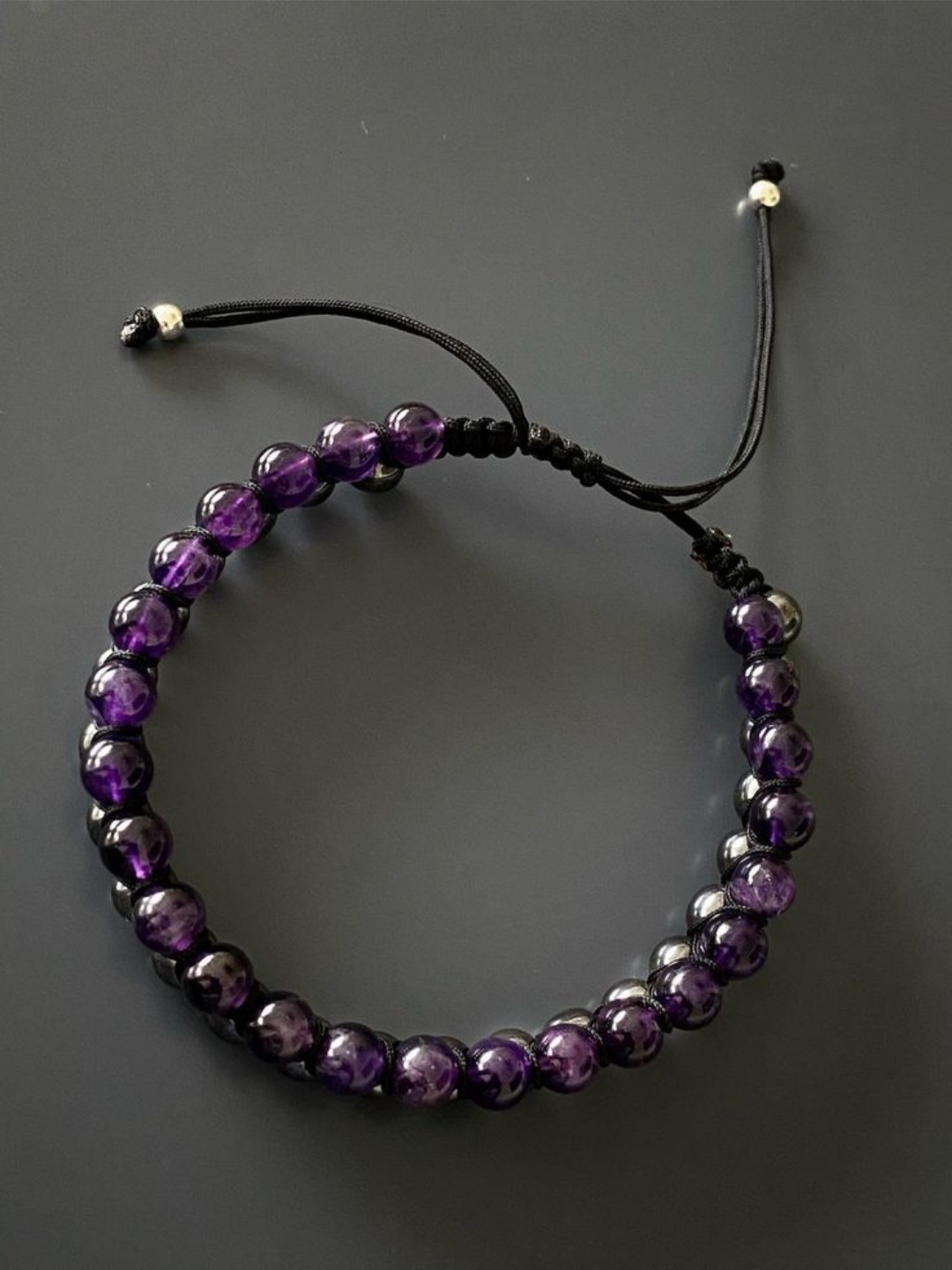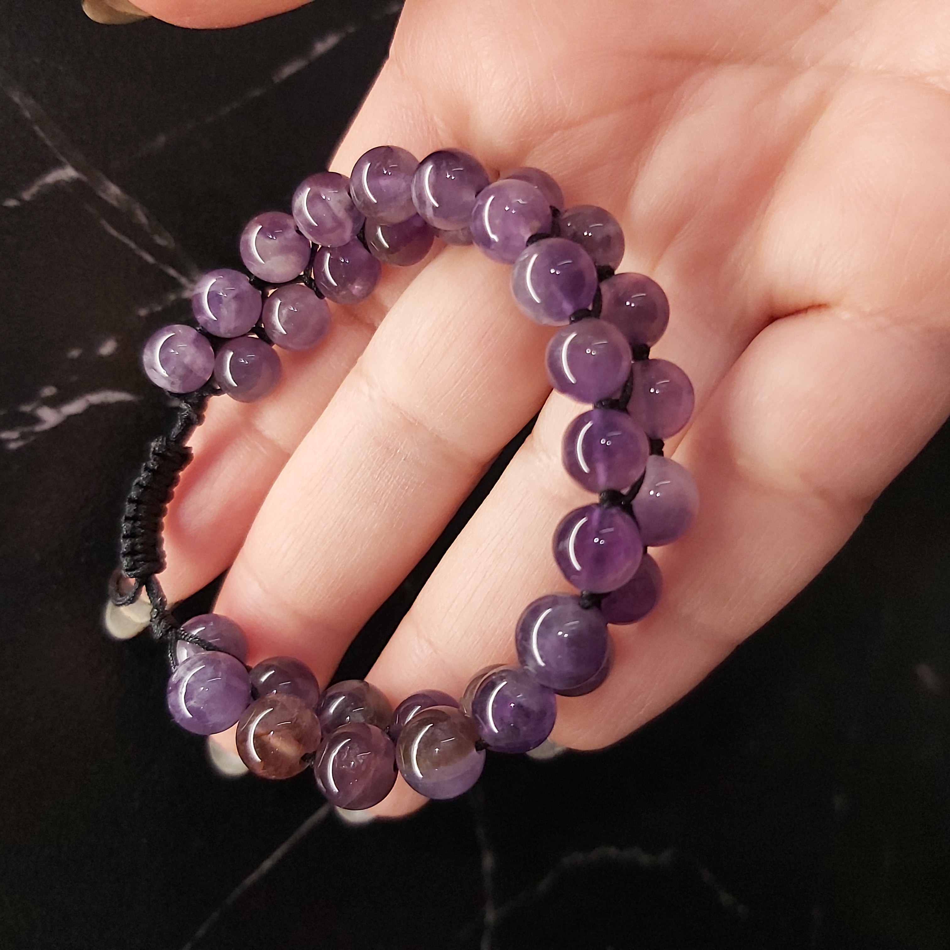 این دستبند زیبا و منحصر به فرد با سنگهای اصل آمیتیست به سایز 8 میل طراحی شده و با بافت گره کشویی، متناسب با دور مچ شما آماده و ارسال میگردد.