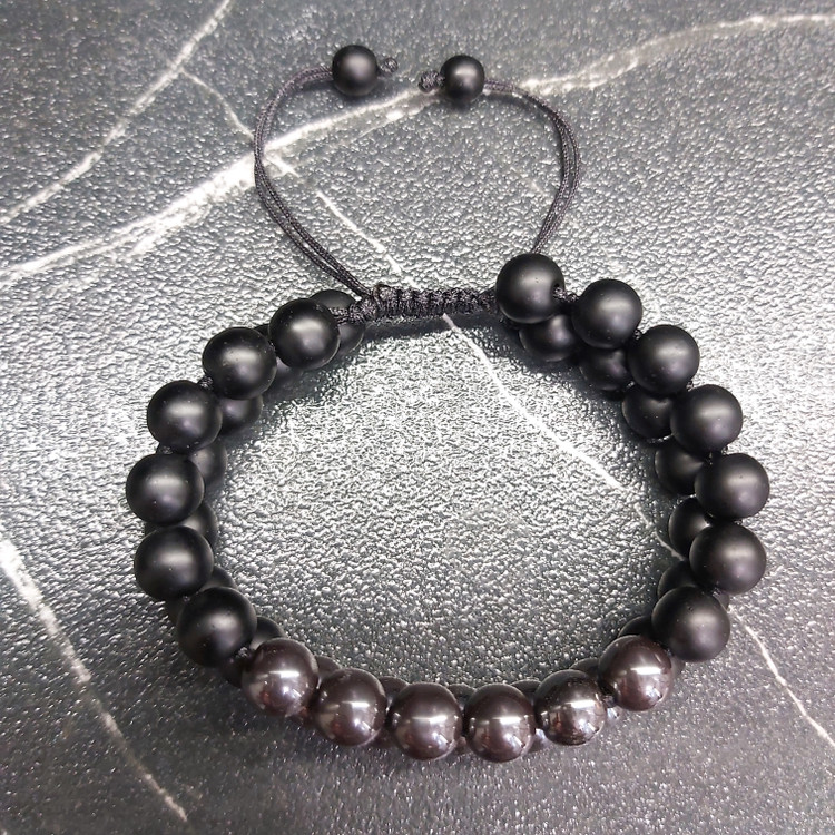 آغاز یک سفر شیک و مدرن با این دستبند زیبا! ترکیب منحصر به فرد سنگهای اونیکس مشکی مات و هماتیت دودی، جلوهای خاص و متفاوت به استایل شما میبخشد.