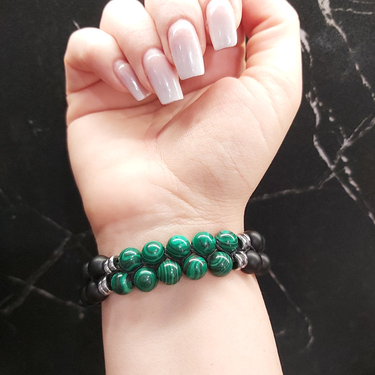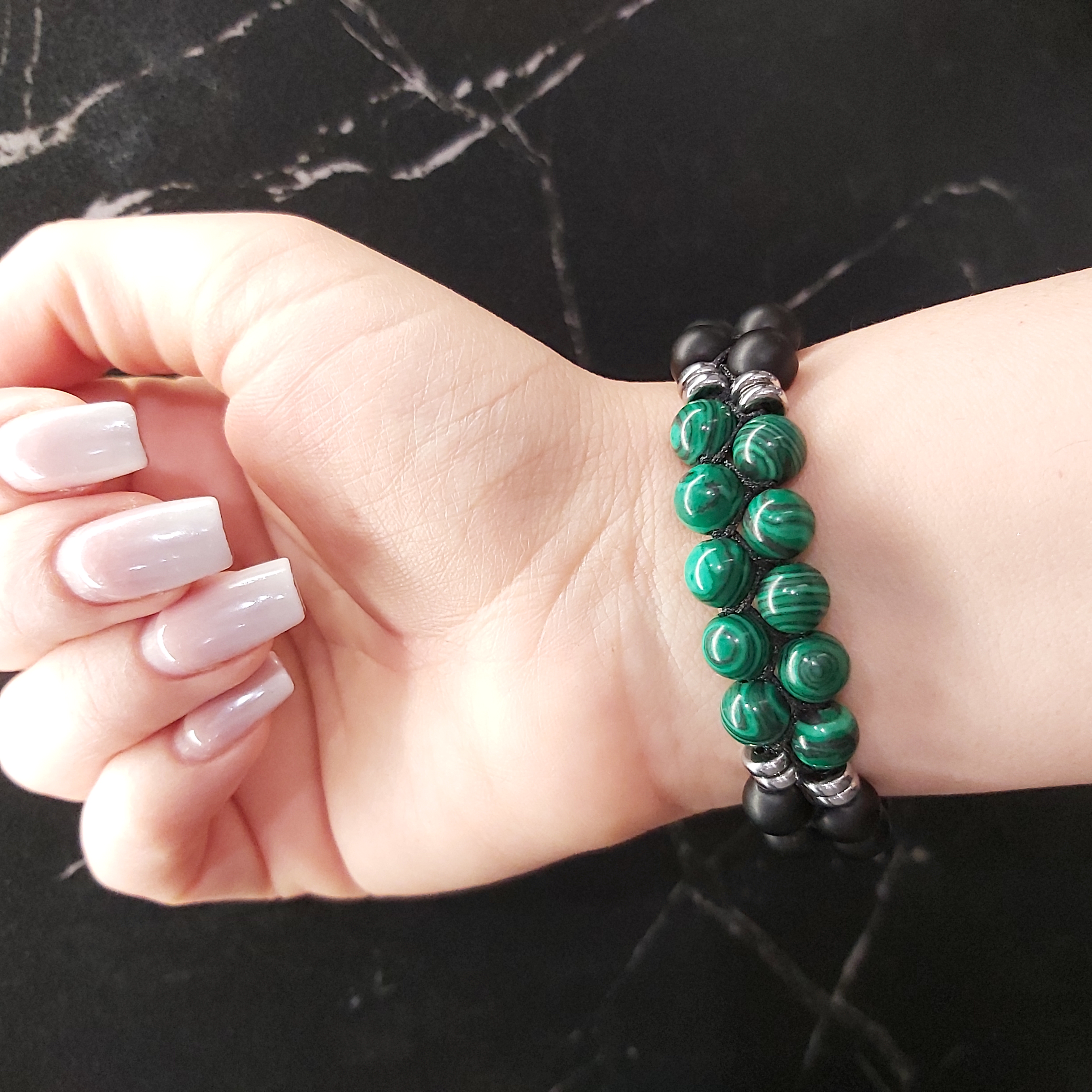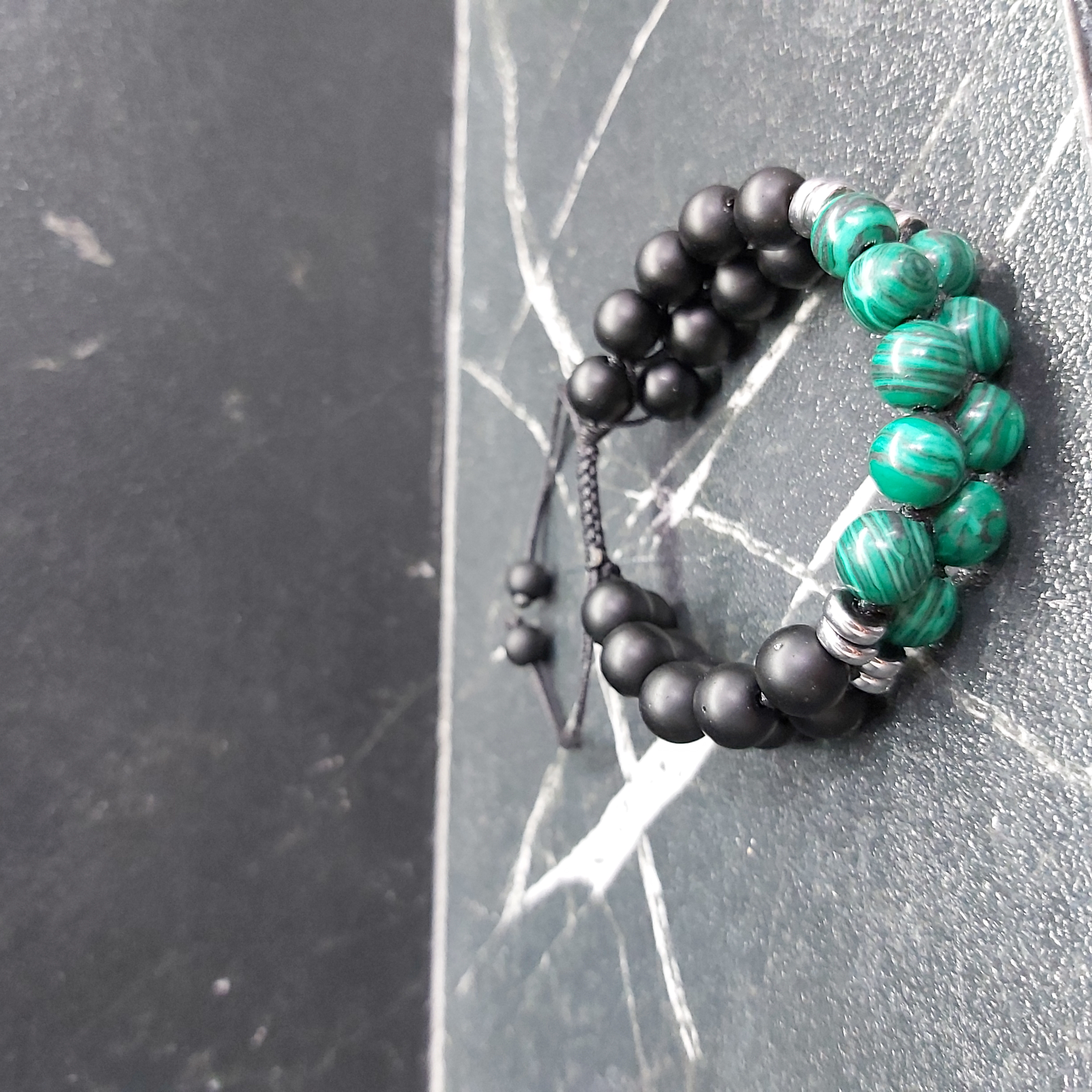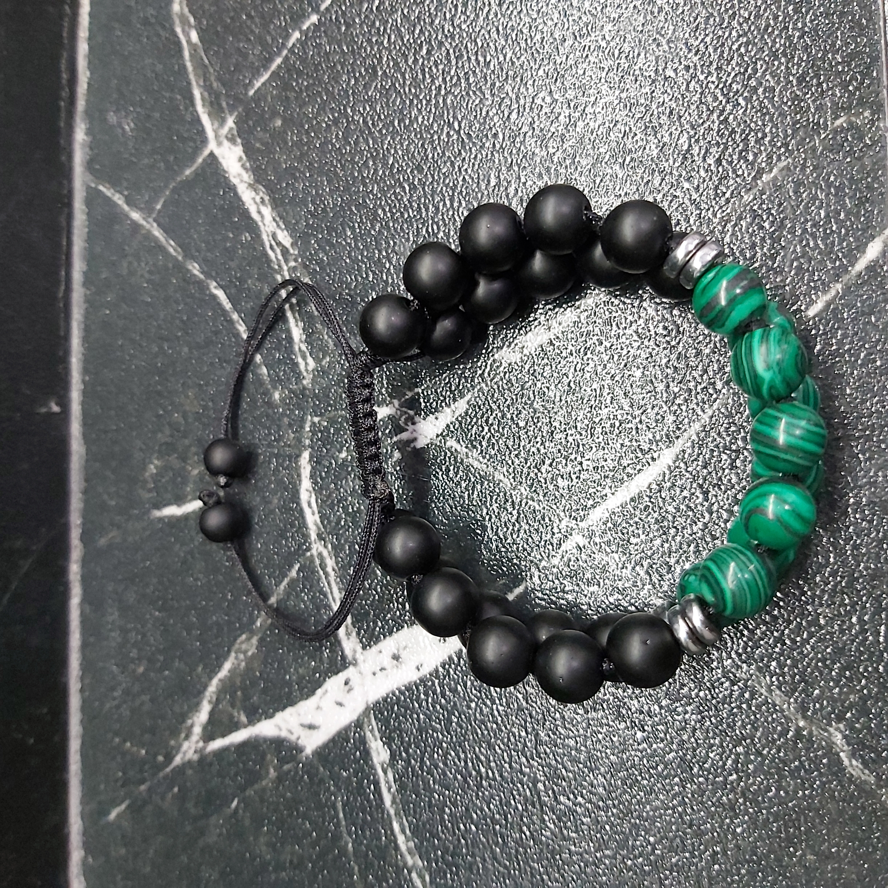 **معرفی محصول: دستبند سنگ مالاکیت و اونیکس مشکی مات با حدید واشری نقره**