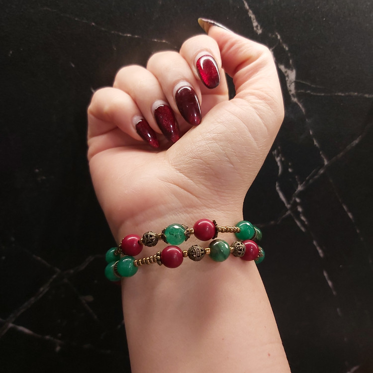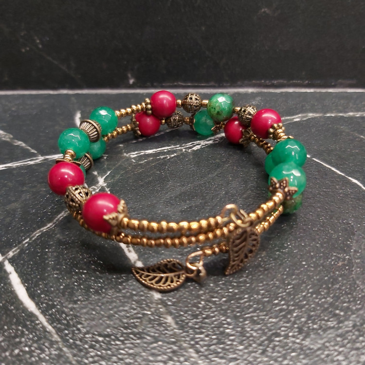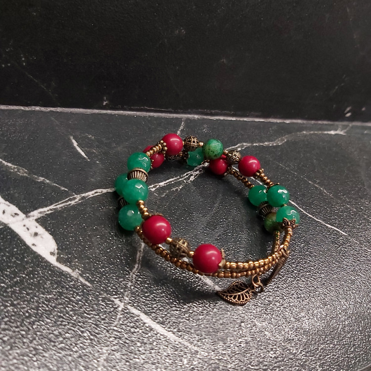 دستبند فنری دو دور یشم و مرجان — آغوشی از طبیعت و شور زندگی