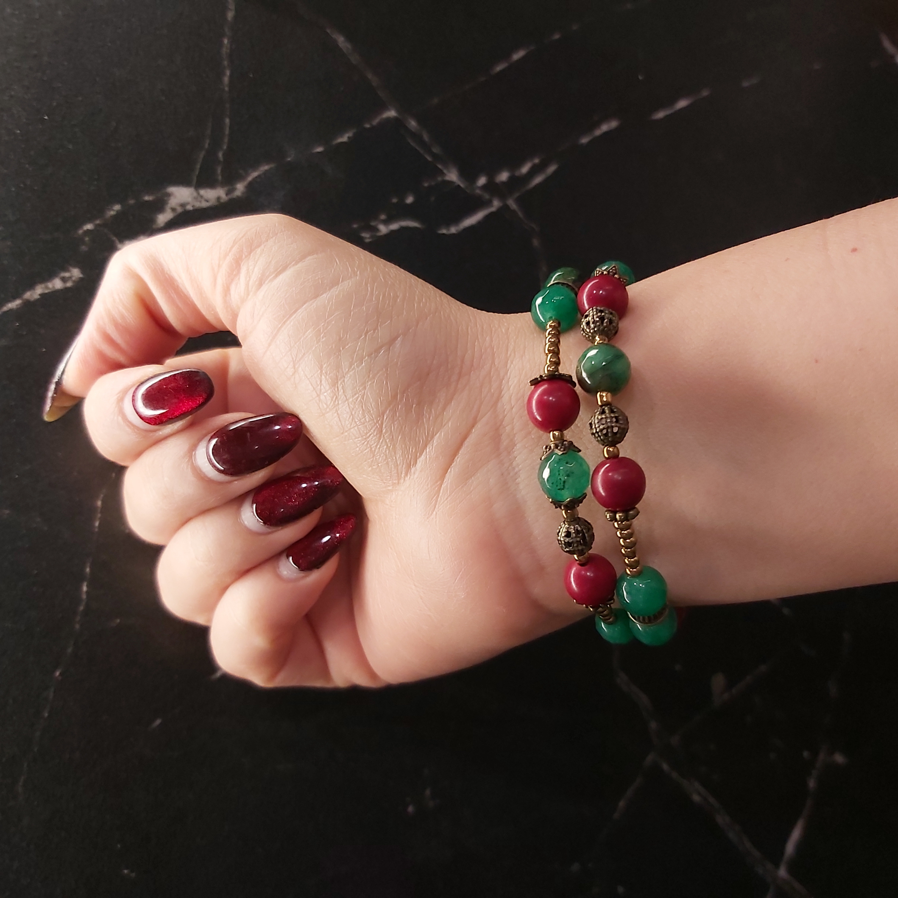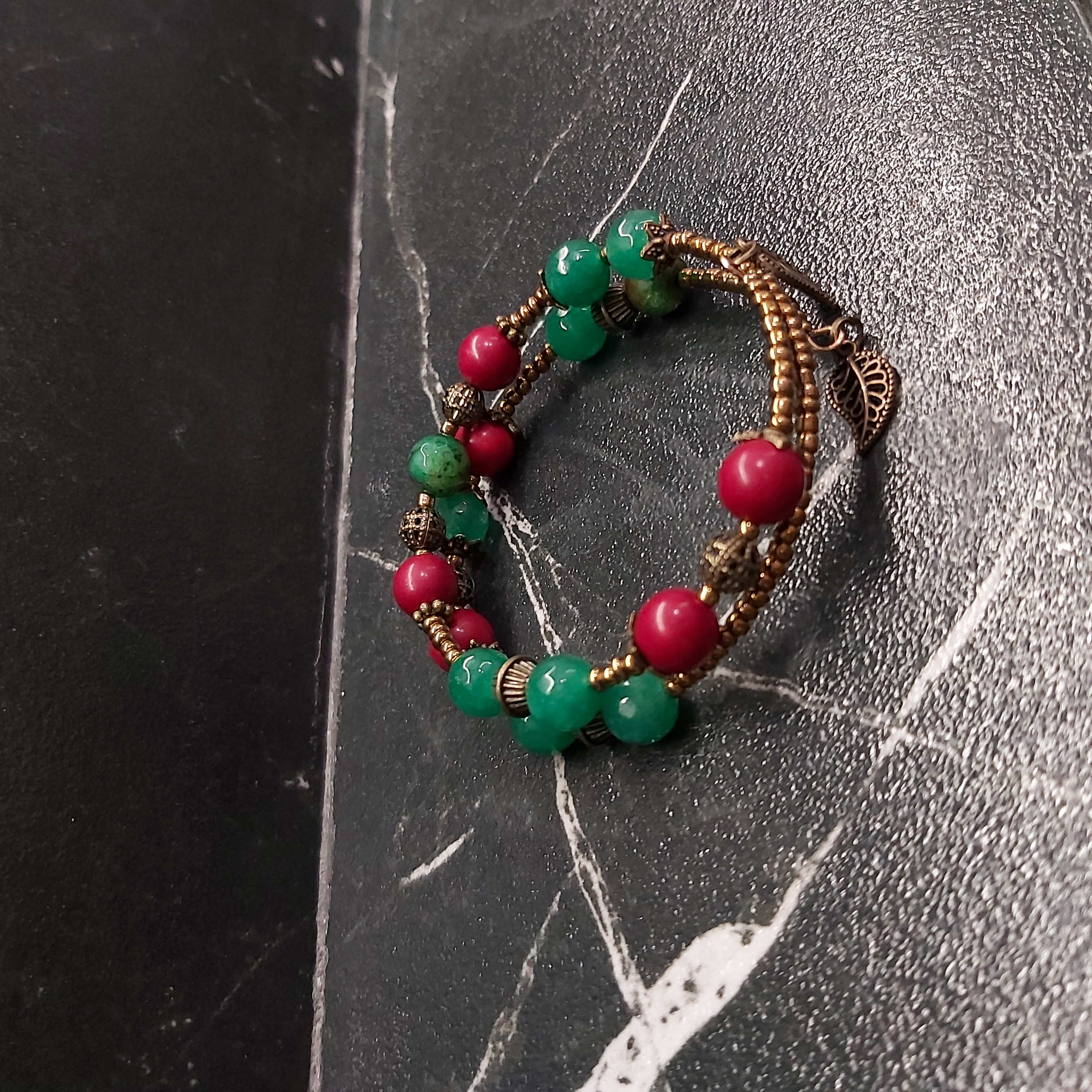دستبند فنری دو دور یشم و مرجان — آغوشی از طبیعت و شور زندگی