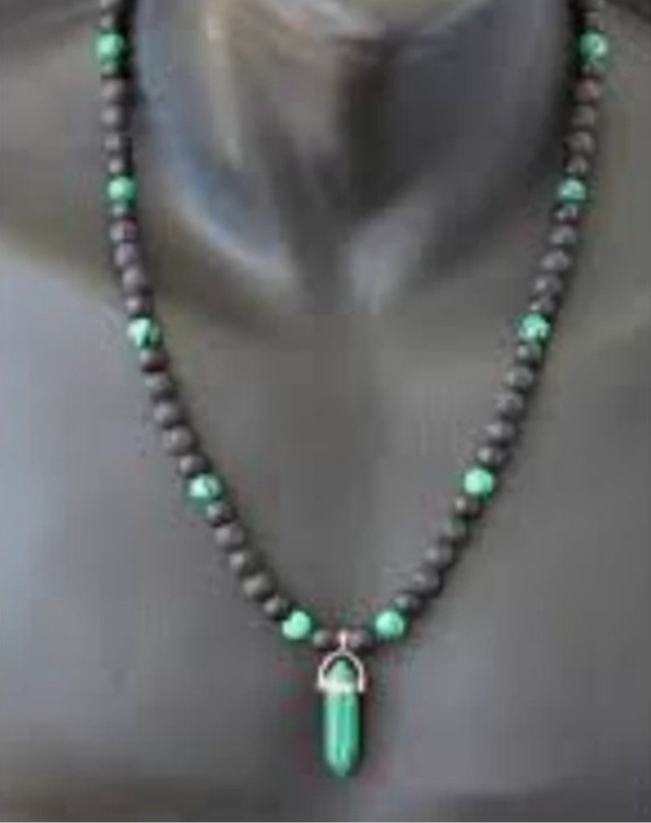 گردنبند مردانه سنگ مالاکیت و لاوا با پلاک منشوری مالاکیت