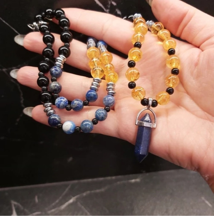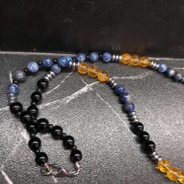 گردنبند از سنگ لاجورد و سیترین و اونیکس و حدید واشری و پلاک منشوری سنگ لاجورد درست شده است.