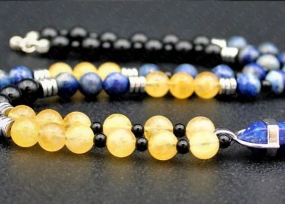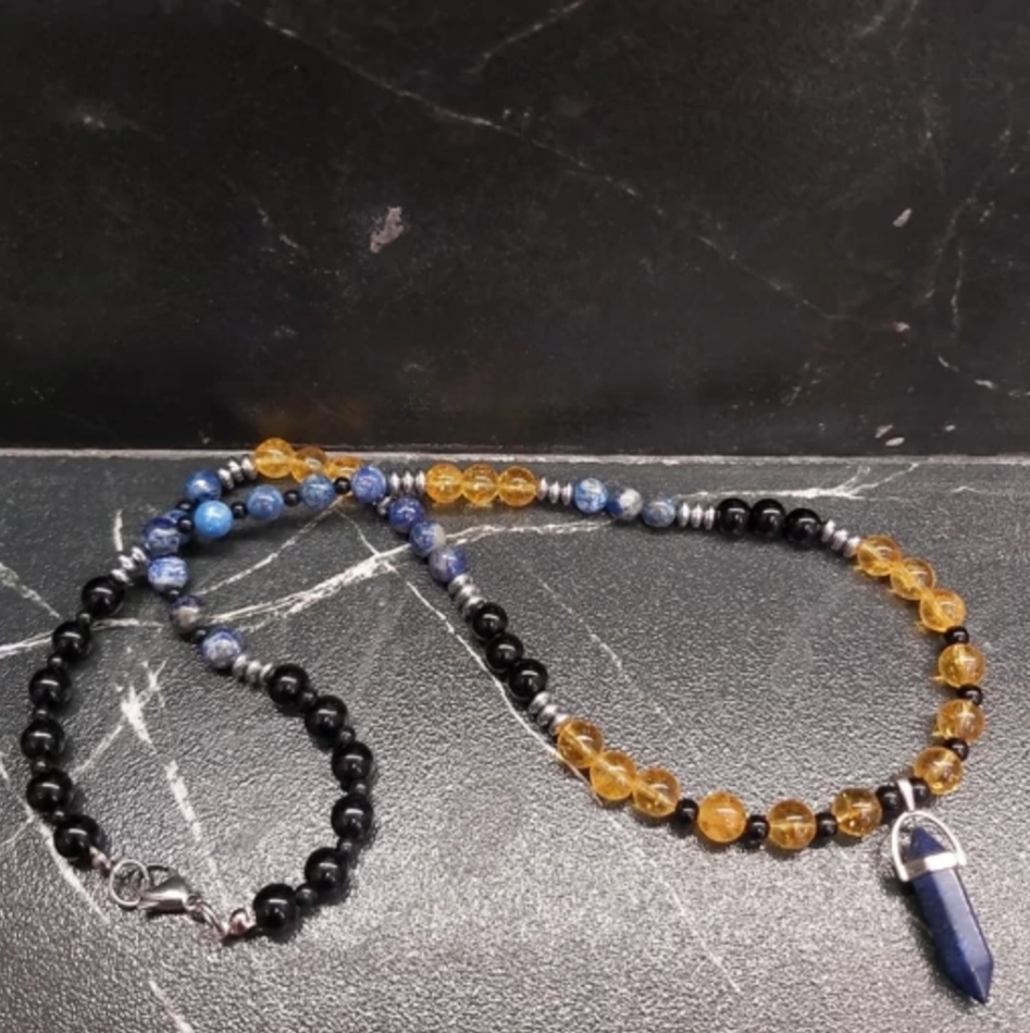 گردنبند از سنگ لاجورد و سیترین و اونیکس و حدید واشری و پلاک منشوری سنگ لاجورد درست شده است.