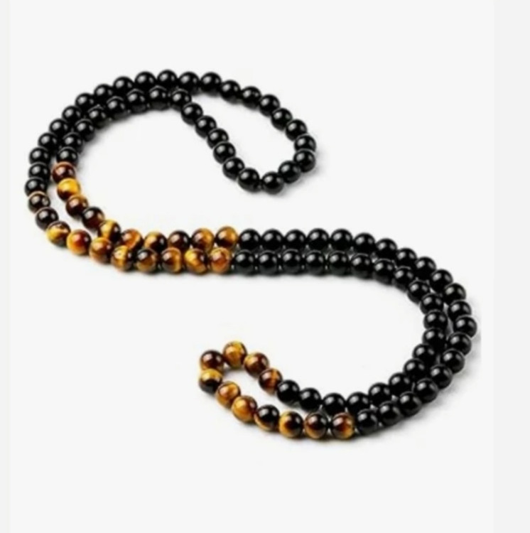 گردنبند از سنگ چشم ببر و اونیکس براق درست شده است