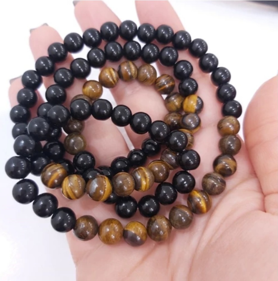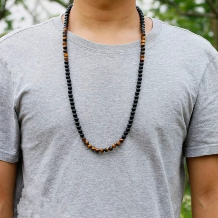 گردنبند از سنگ چشم ببر و اونیکس براق درست شده است