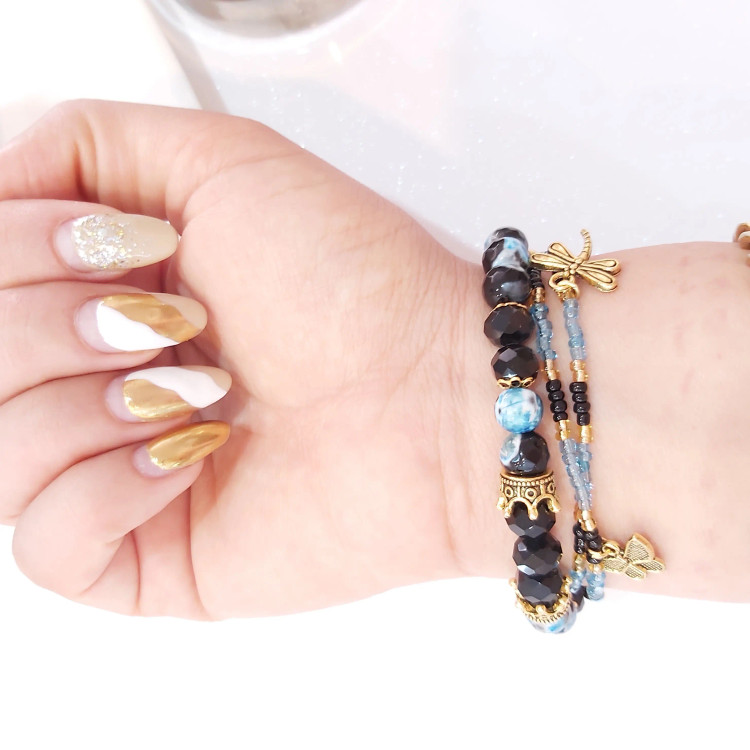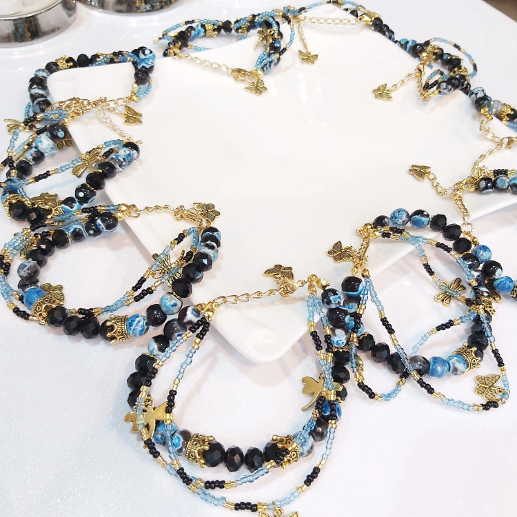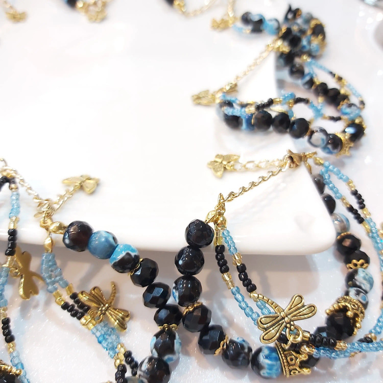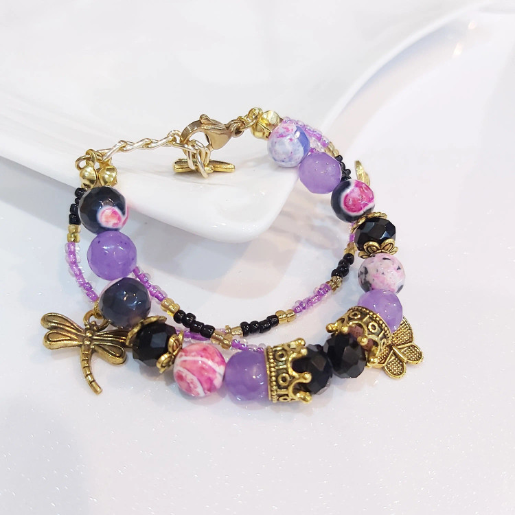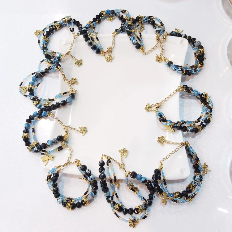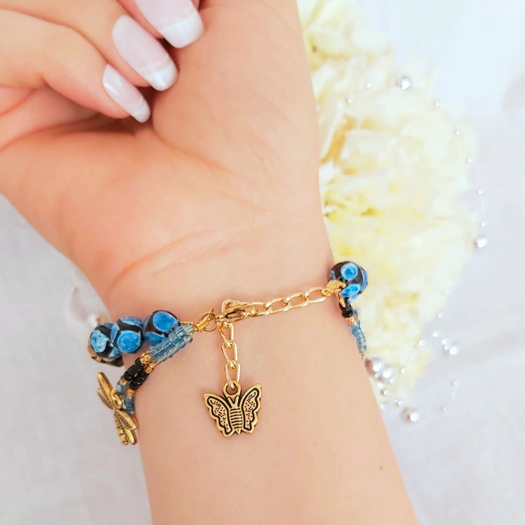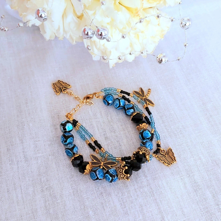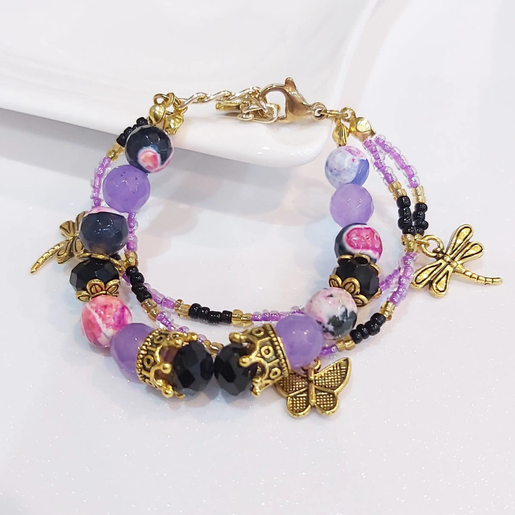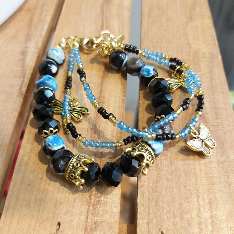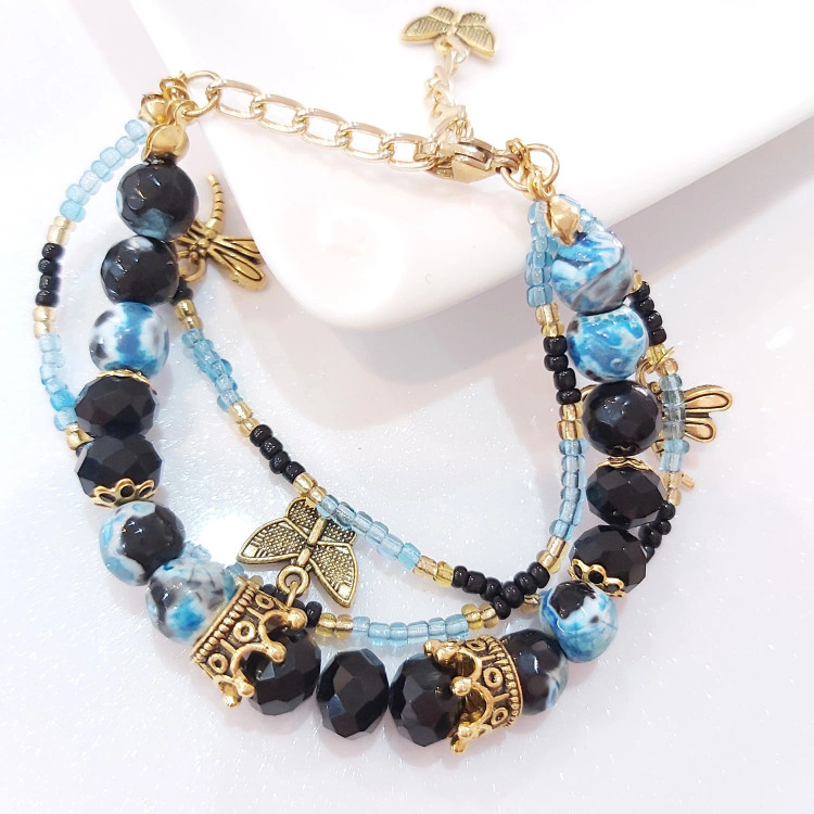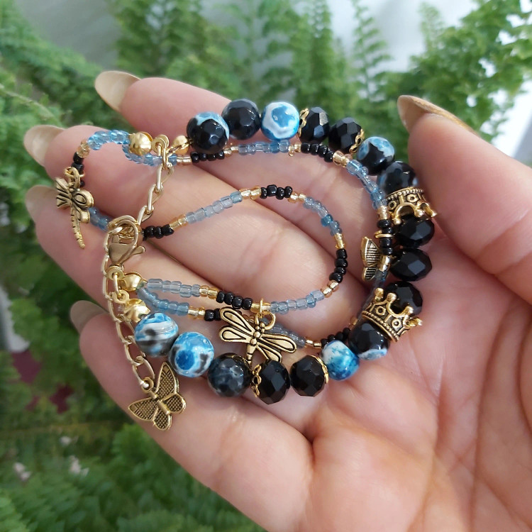این دستبند از سنگ عقیق برزیلی با رگه های مشکی با منجوق های درجه یک و آویزهای پروانه و شاپرک و تاج فلزی کوتاه و سنگ کریستال مشکی به همراه قفل و زنجیر رنگ ثابت درست شده است مناسب هدیه دادن🎁 مناسب خانم ها و دختران خاص پسند