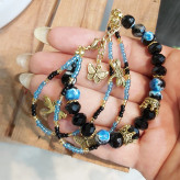 این دستبند از سنگ عقیق برزیلی با رگه های مشکی با منجوق های درجه یک و آویزهای پروانه و شاپرک و تاج فلزی کوتاه و سنگ کریستال مشکی به همراه قفل و زنجیر رنگ ثابت درست شده است مناسب هدیه دادن🎁 مناسب خانم ها و دختران خاص پسند