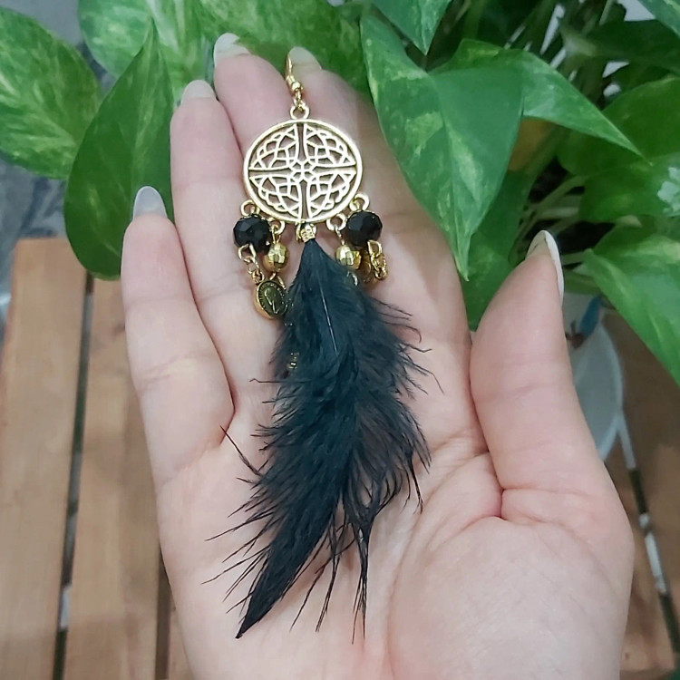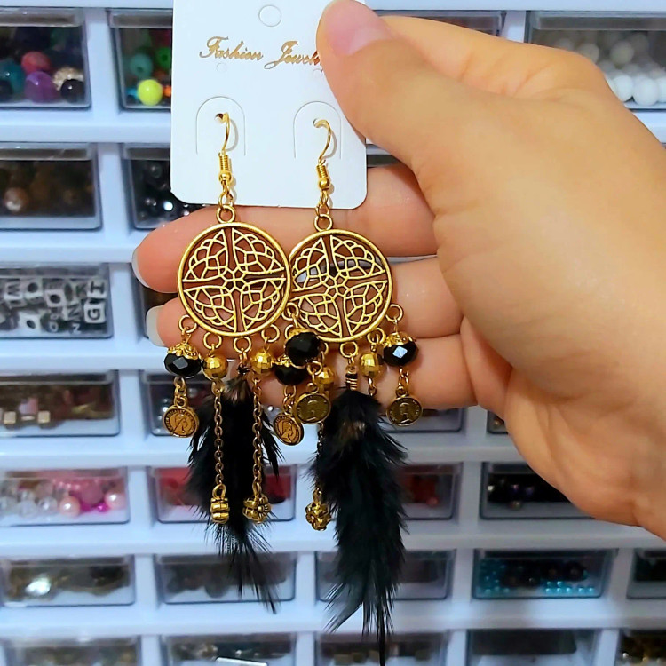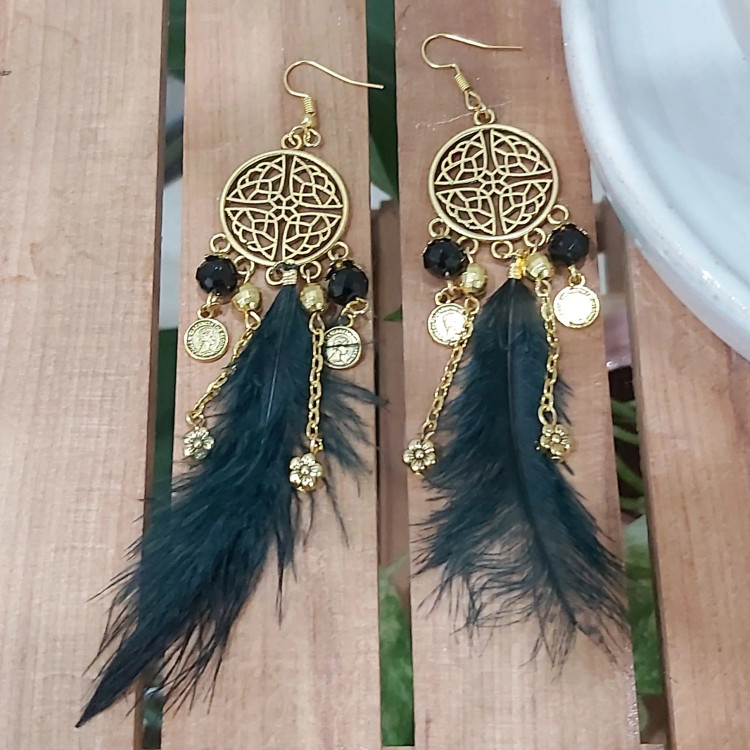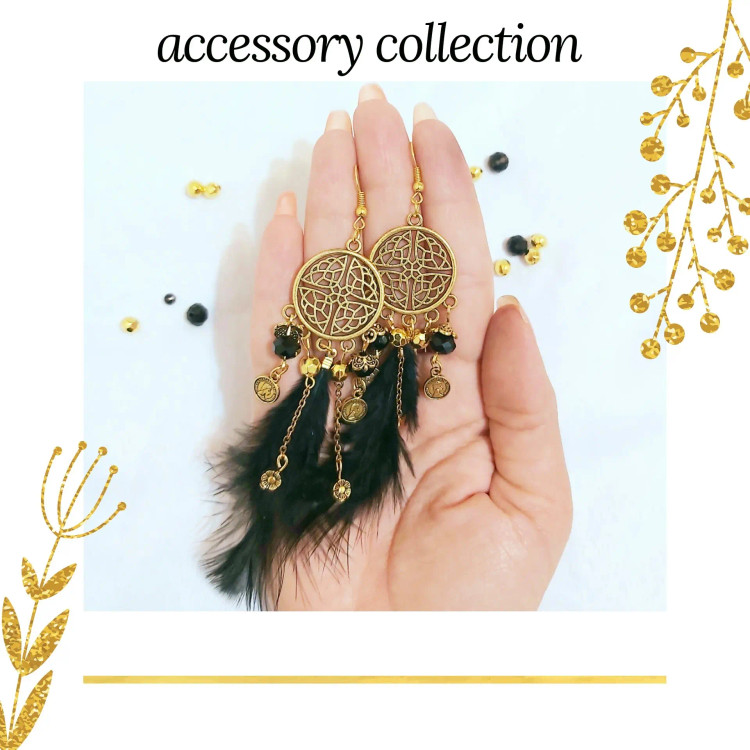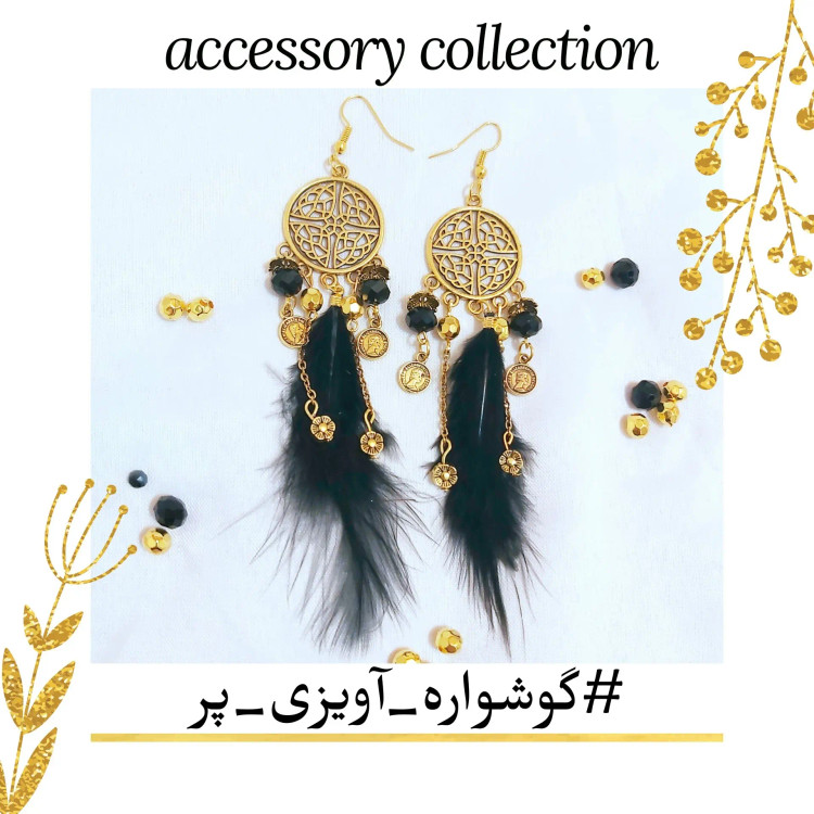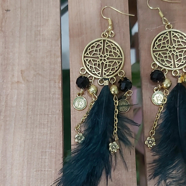 گوشواره آویزی پر مشکی و طلایی کریستال آویزدار زنجیر سکه گل اکسسوری زیورآلات زنانه دخترانه