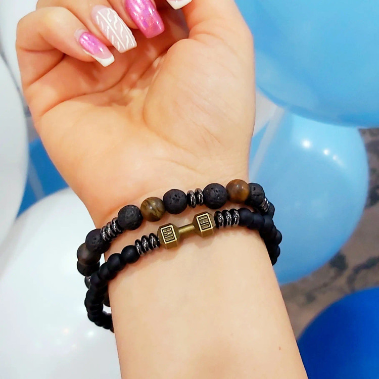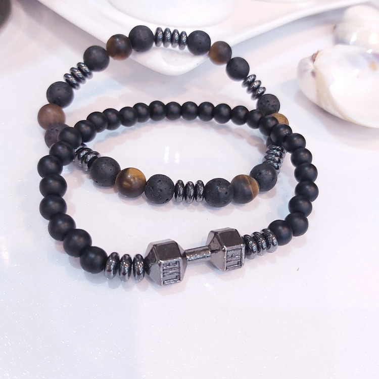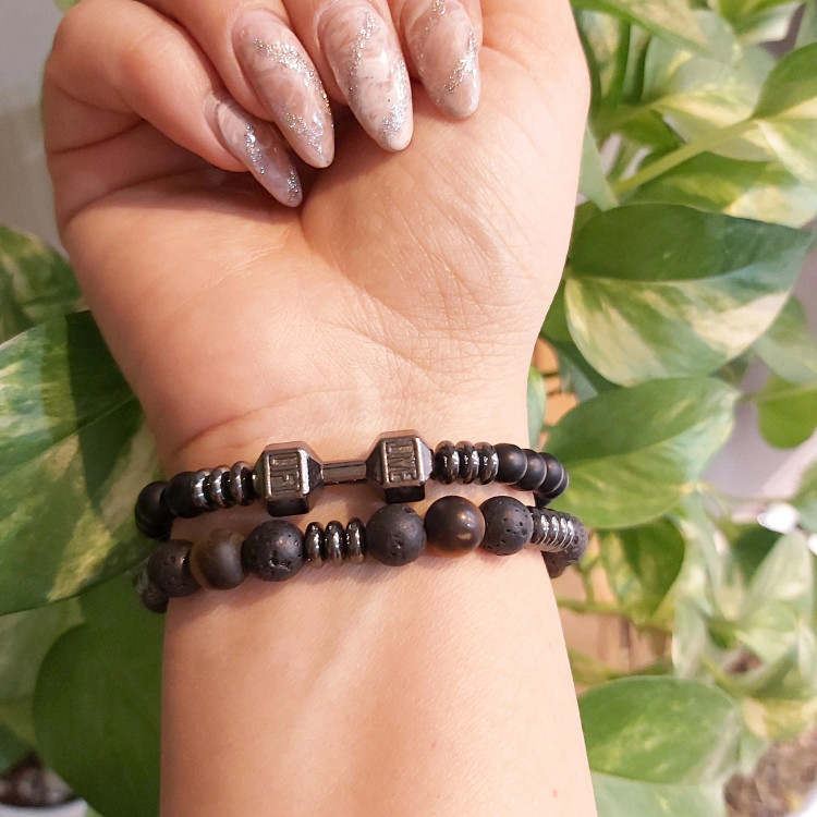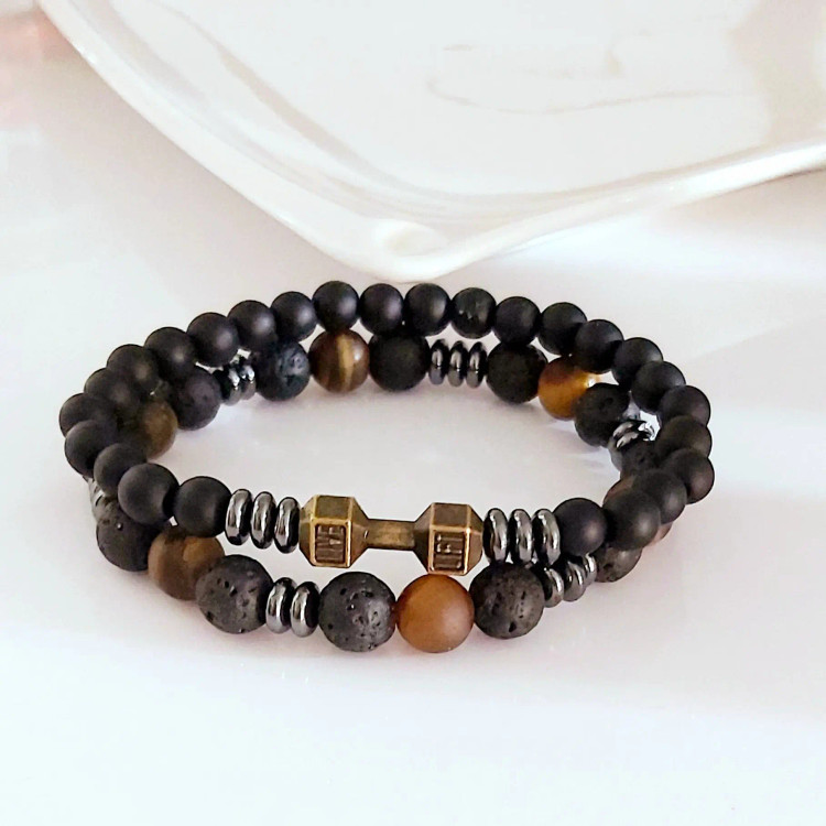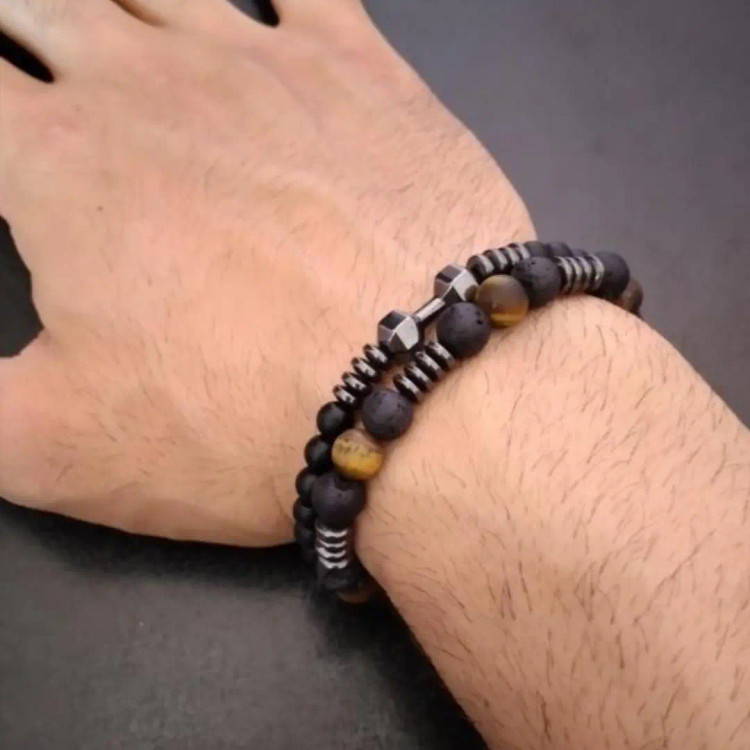 ست از دو دستبند کشی که یکی از اونیکس مشکی و حدید واشری و دمبل درست شده است و دیگری با سنگ چشم ببر مات و سنگ لاوا و حدید واشری دودی درست شده است. ست دستبند رنگ ثابت هستن💯 مناسب جهت هدیه دادن 🎁 مناسب ورزشکاران و بدنسازان 💪🏋️⛹️ مناسب آقایان و پسران خوش پوش اسپرت 🙋🏻♂️