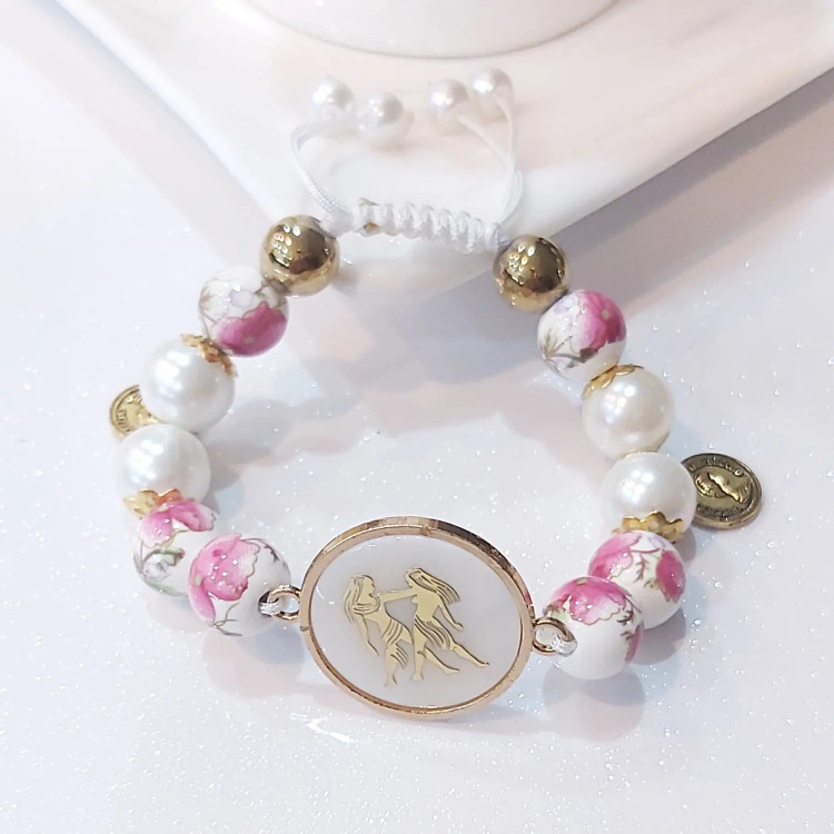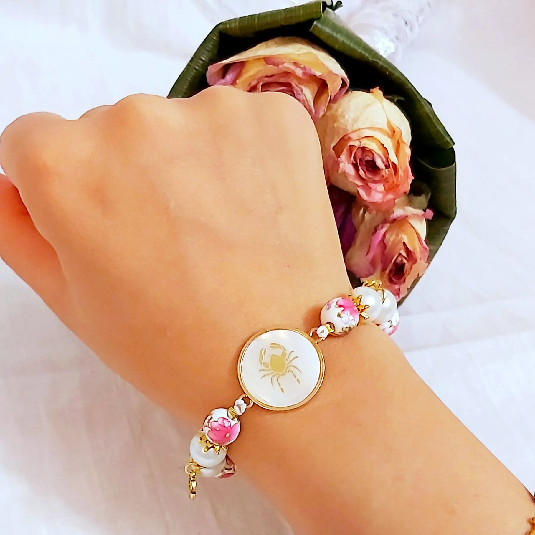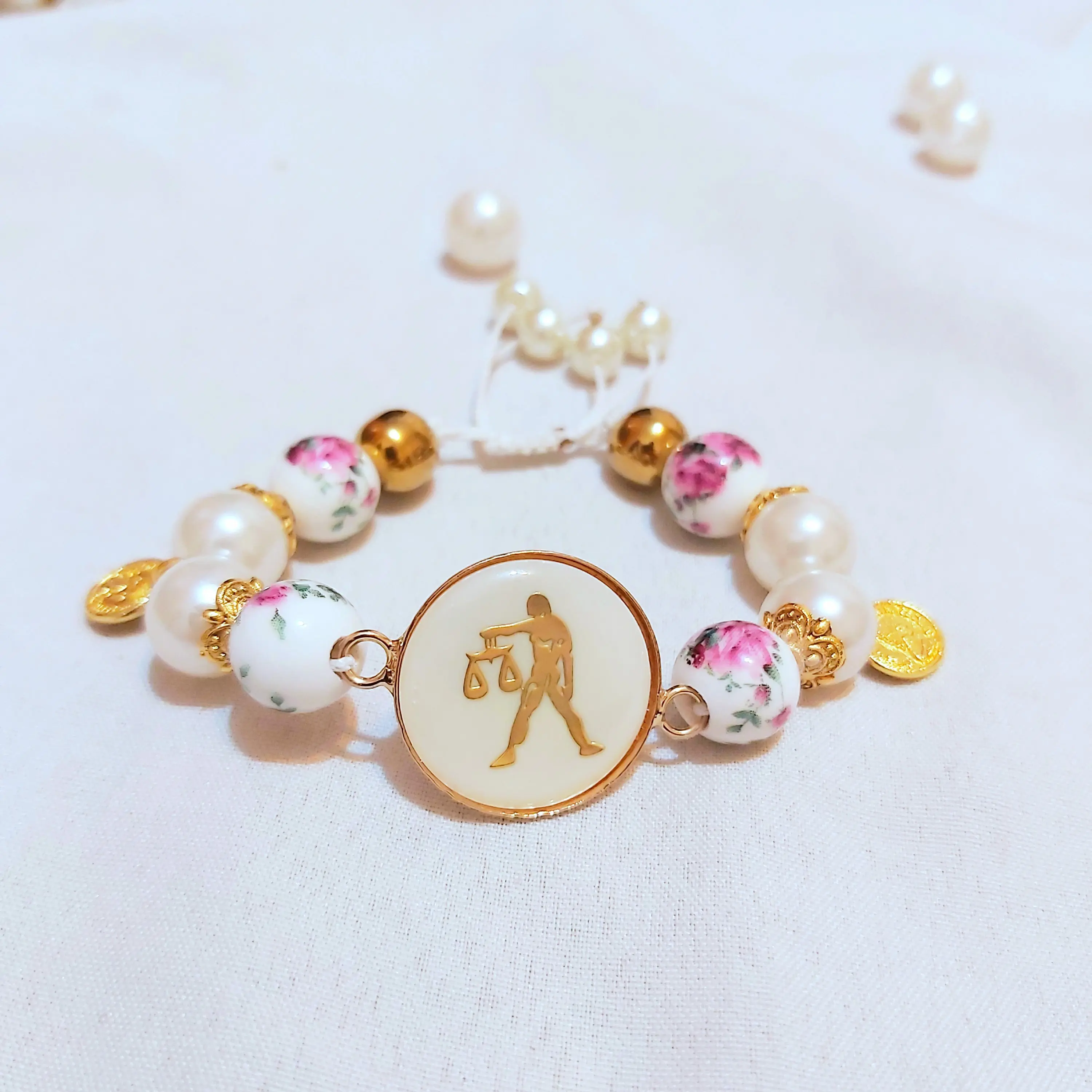 دستبند ماه تولد سفید مرواریدی گلدار طلایی آویزدار سرامیکی اکسسوری زیورآلات