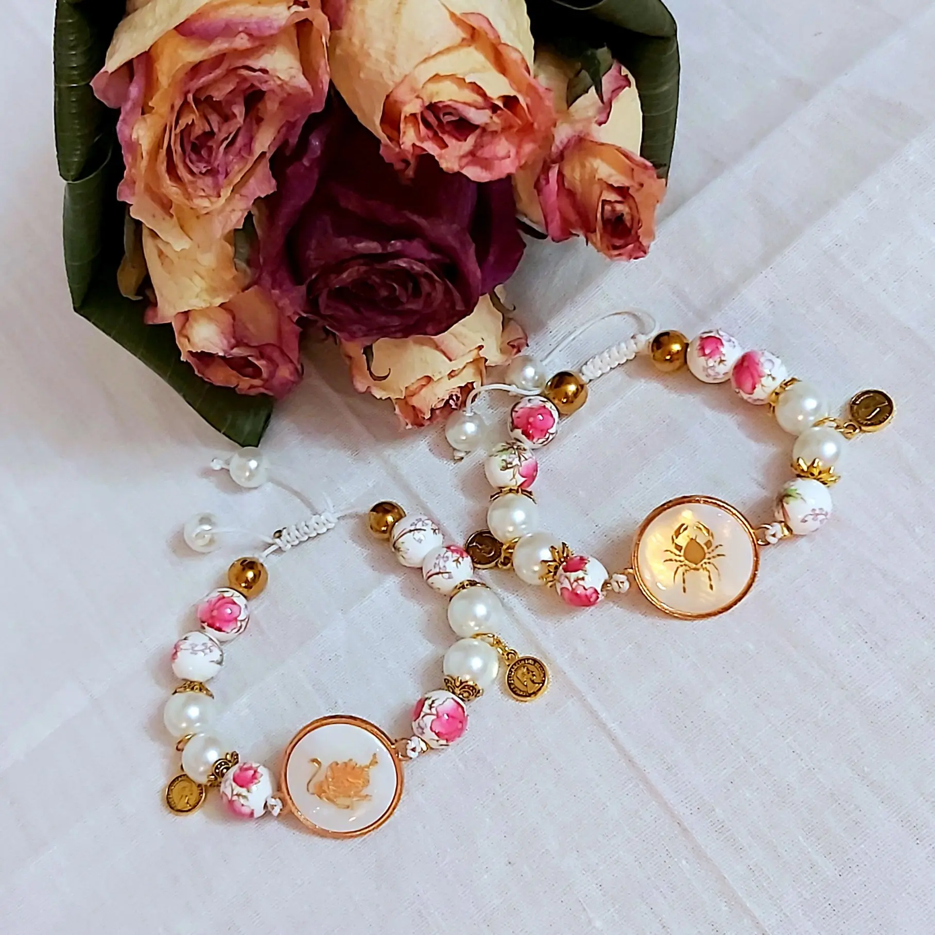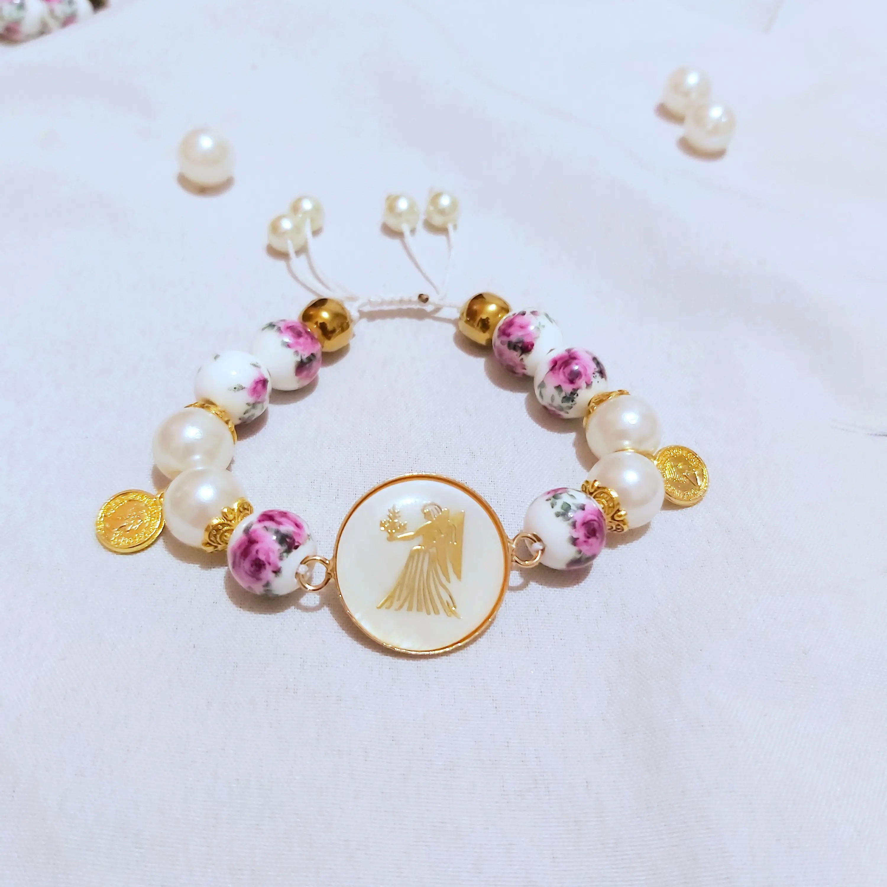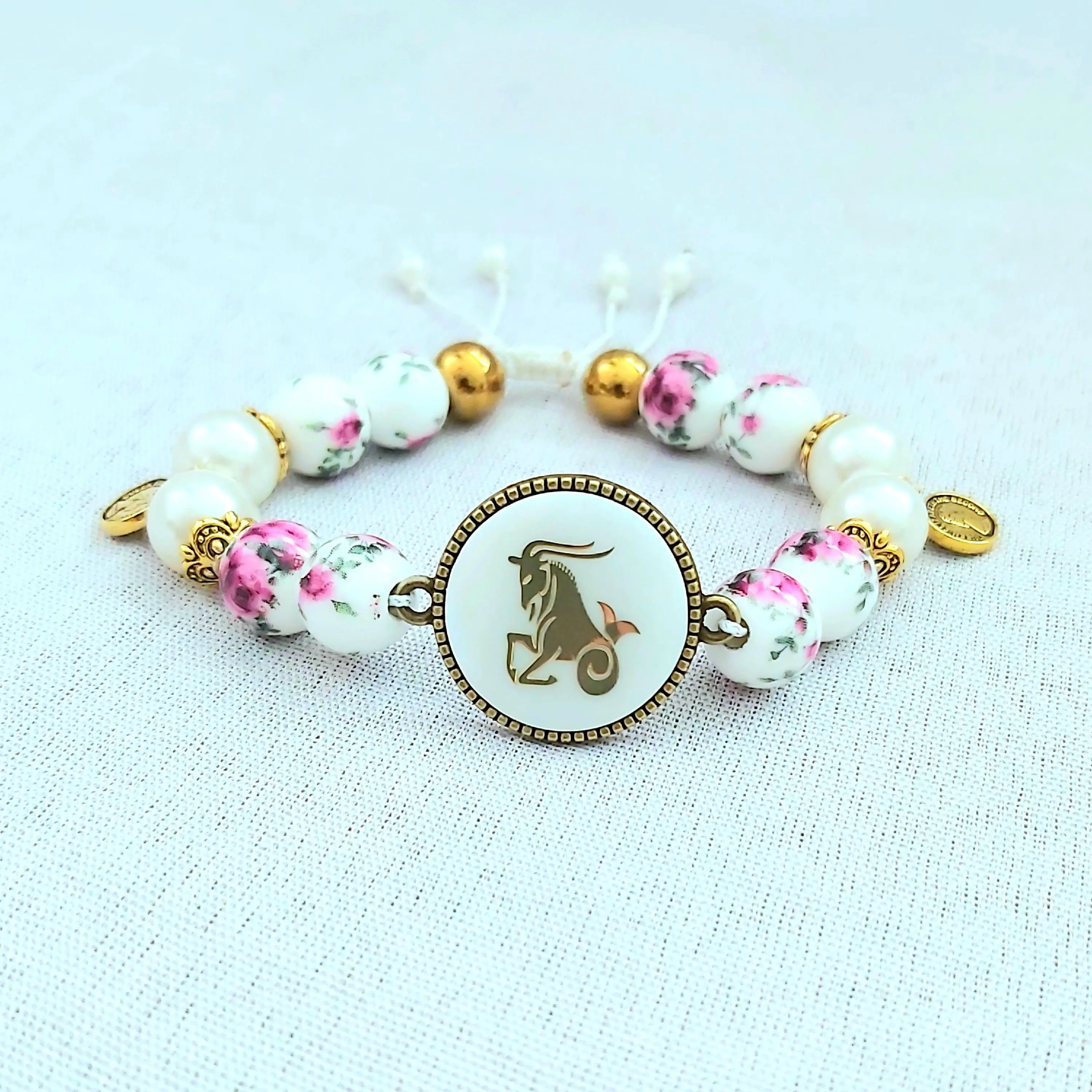 دستبند ماه تولد سفید مرواریدی گلدار طلایی آویزدار سرامیکی اکسسوری زیورآلات