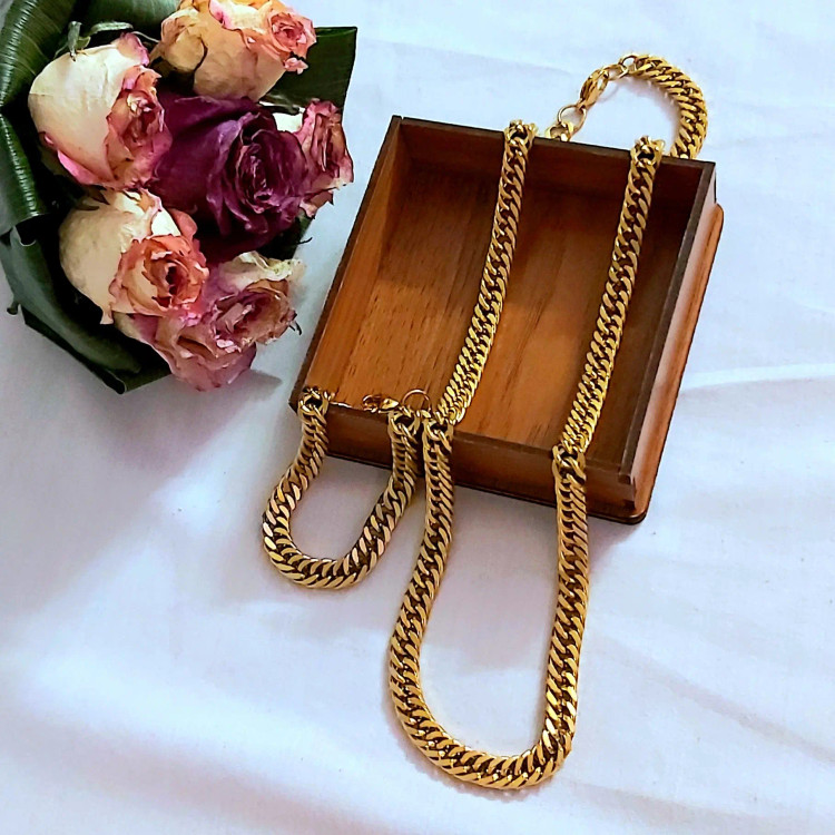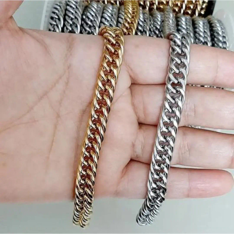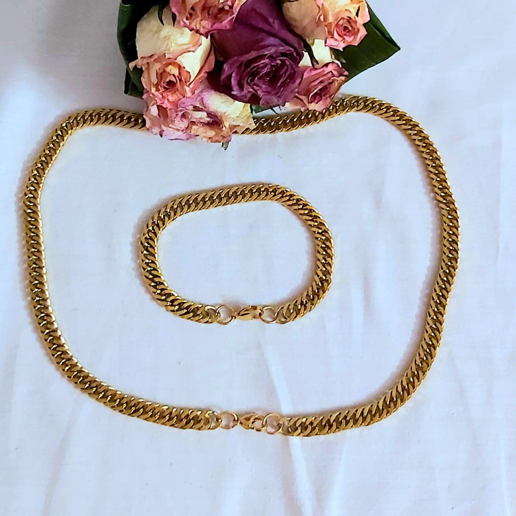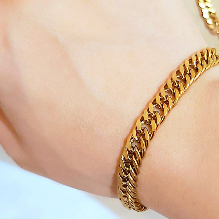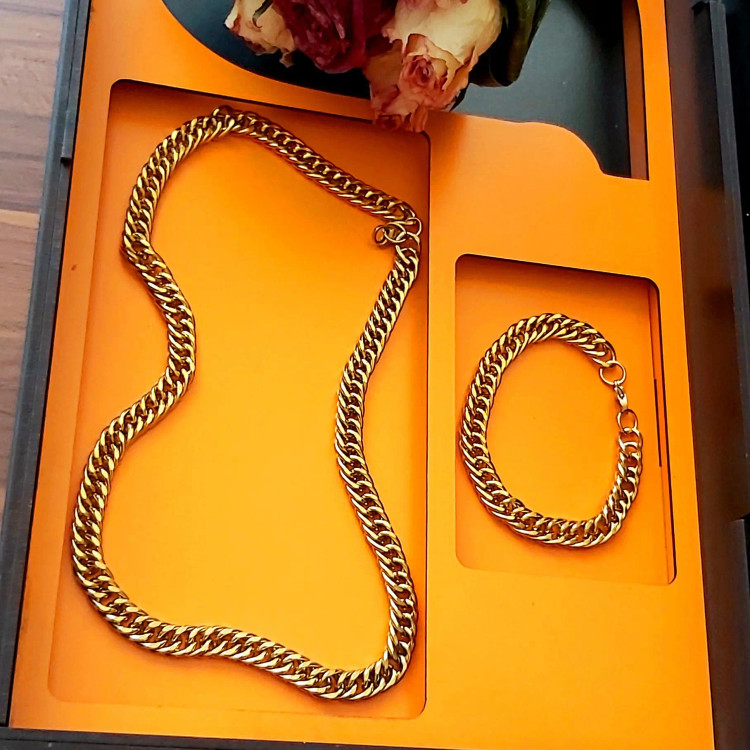 ست گردنبند و دستبند از زنجیر کارتیه استیل دوبل تراشدار پهن و قفل و حلقه و اتصالات استیل که همگی رنگ ثابت هستن درست شده است. ⚜ طول گردنبند ۵۰ سانت میباشد ⚜ طول دستبند متناسب با دور مچ مشتری میباشد کاملاً مشابه طلا و استفاده روزانه 🚶🏻♀️ رنگ ثابت و استیل و ضد حساسیت و کیفیت عالی و درجه یک 💯 بخاطر اسپرت بودن محصول مناسب هم خانم ها هم آقایان 🙋🏻♀️🙋🏻♂️👌
