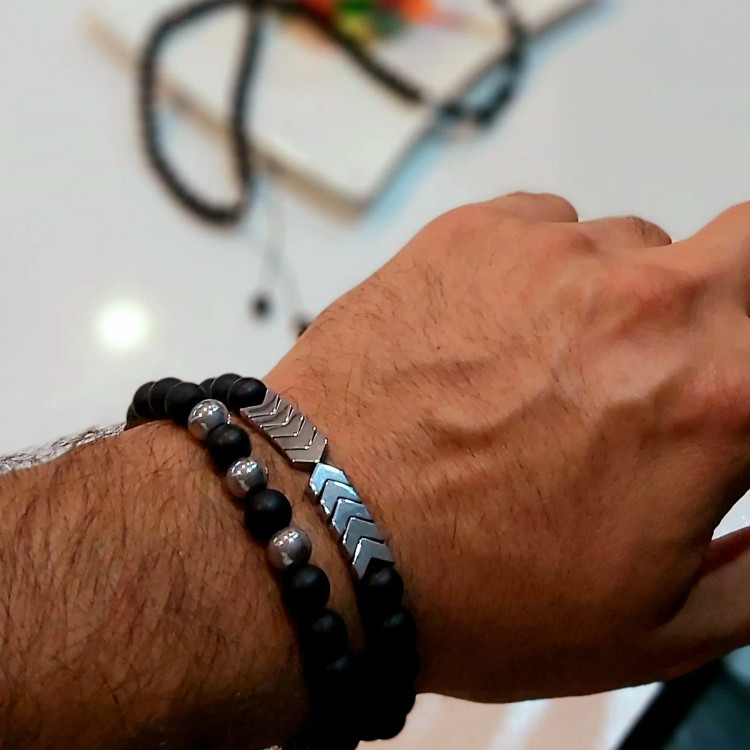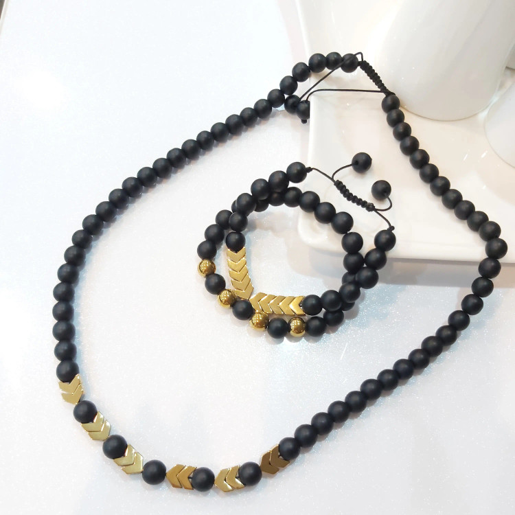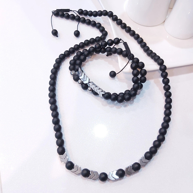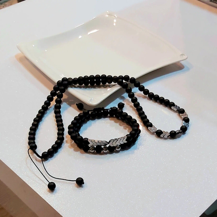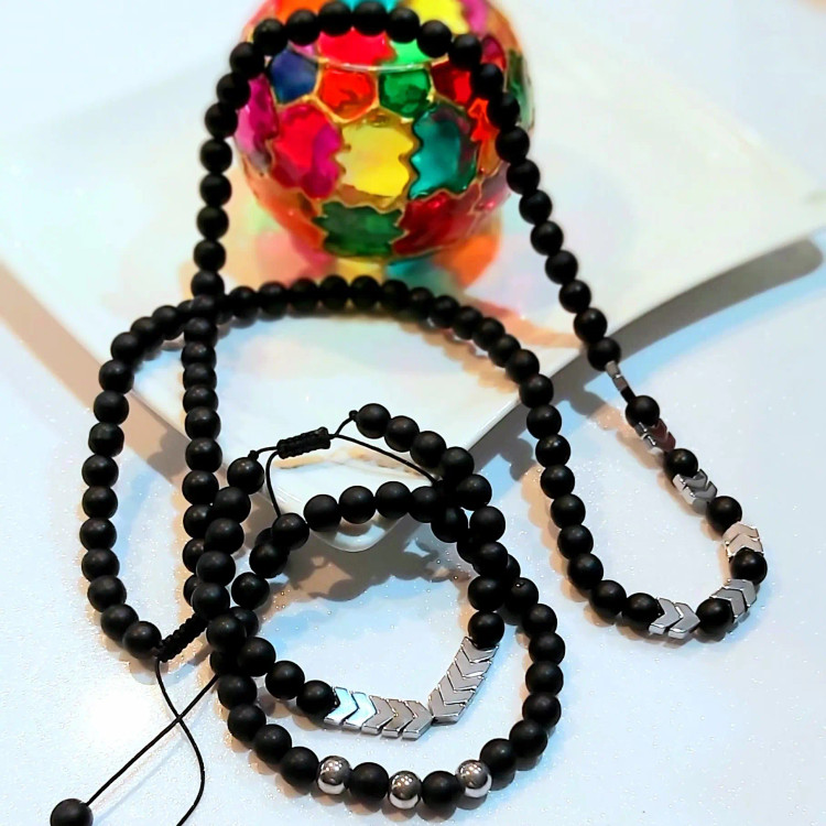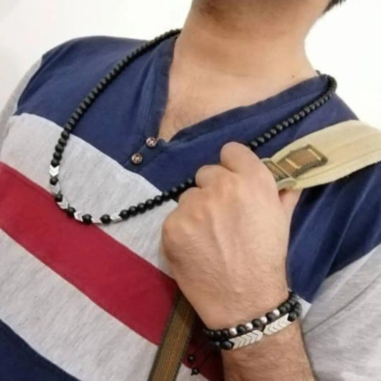 ست گردنبند و دستبند از سنگ اونیکس مشکی مات و سنگ حدید گرد و فلشی نقره ای درست شده است که همگی رنگ ثابت میباشند. گردنبند بصورت گره کشویی جهت راحتی استفاده و کوتاه و بلند کردن گردنبند میباشد. ست دستبند یکی کشی و دیگری بصورت گره کشویی جهت راحتی استفاده و فیکس کردن دور مچ دست استفاده شده است. مناسب هدیه دادن 🎁 مناسب آقایان و پسران خوش پوش و اسپرت و خوش سلیقه 🙋🏻♂️👍