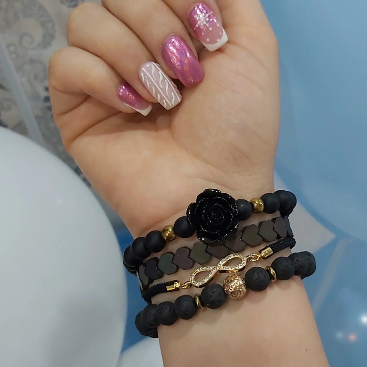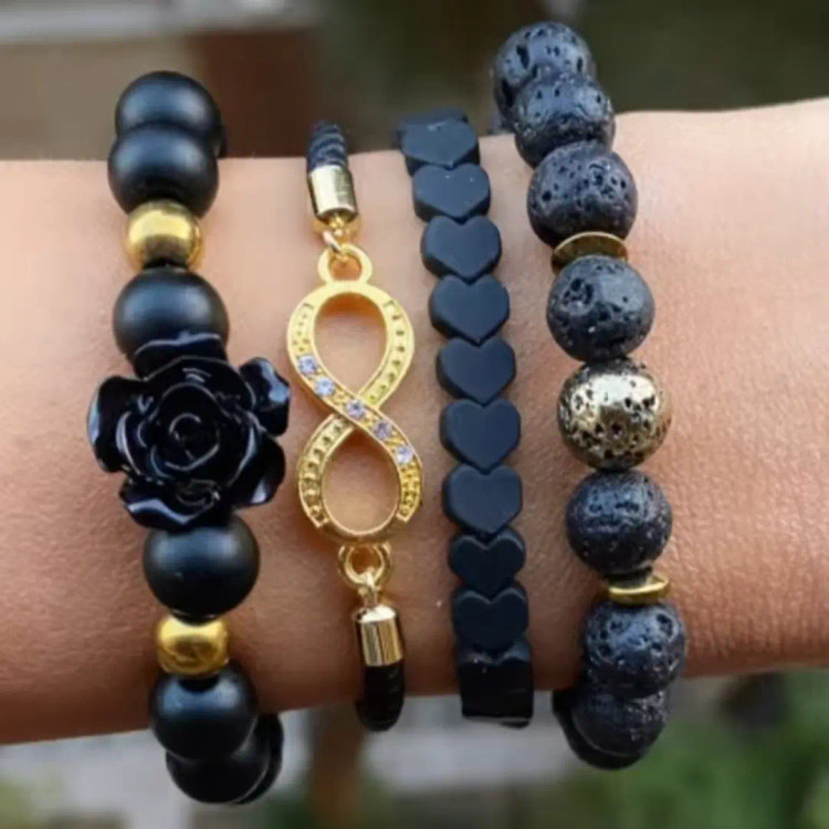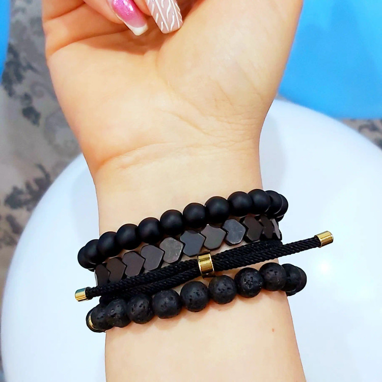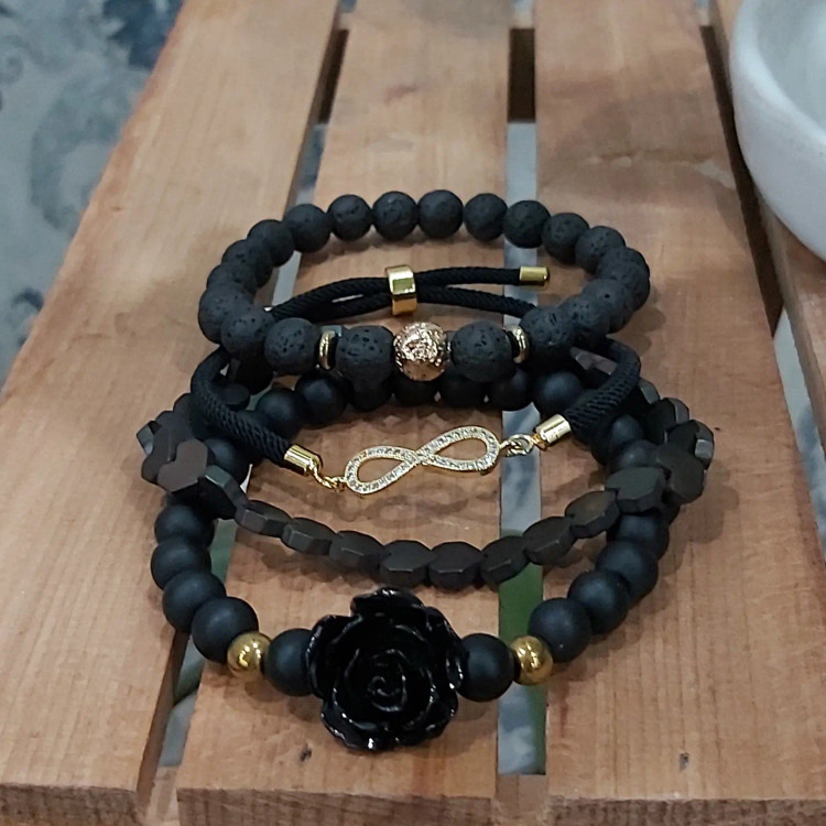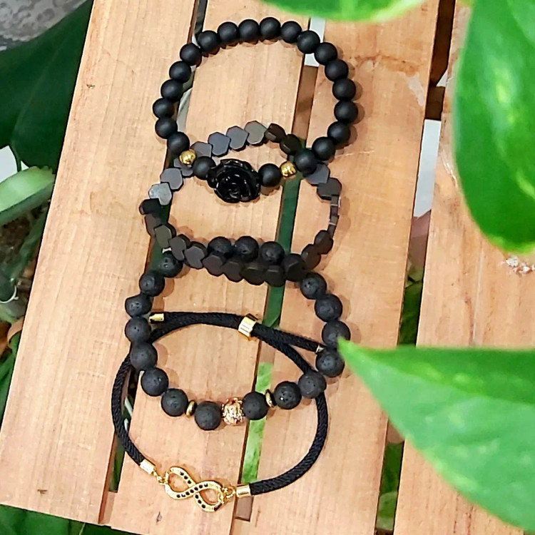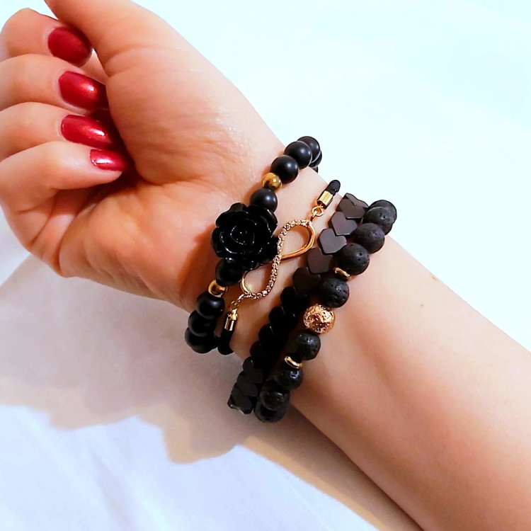 ست دستبند زنانه سنگ لاوا و اونیکس و حدید با پلاک بینهایت اکسسوری دستساز رنگ ثابت