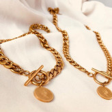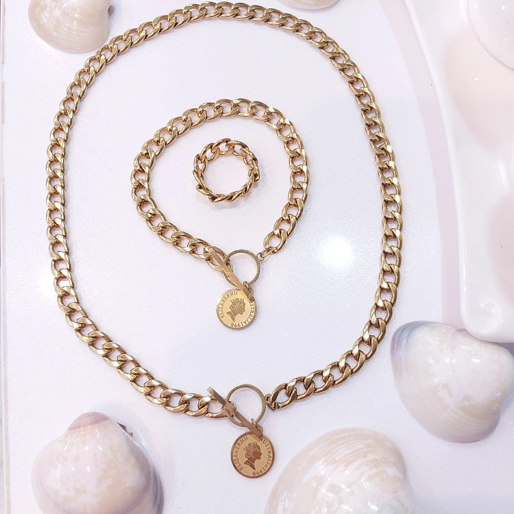 ست گردنبند و دستبند و انگشتر از زنجیر کارتیر استیل و سکه الیزابت استیل و قفل تی و اتصالات استیل که همگی رنگ ثابت هستن 💯درست شده است مناسب جهت هدیه دادن به عزیزانتان 🎁 مناسب خانم ها و دختران شیک پوش و لاکچری و خوش سلیقه 🙋🏻♀️👌 مناسب کسانی که طرفدار زیورآلات رنگ ثابت و مشابه طلا میباشد، هستن. ⚜ لطفا بعد از ثبت سفارش اندازه دور مچ تان را با متر بصورت کیپ اندازه بگیرید و بهم اعلام کنيد بصورت کیپ بگید چون خودم دو سانت اضافه میگیرم براتون ⚜ قابل سفارش در دو رنگ طلایی و نقره ای 💛🤍