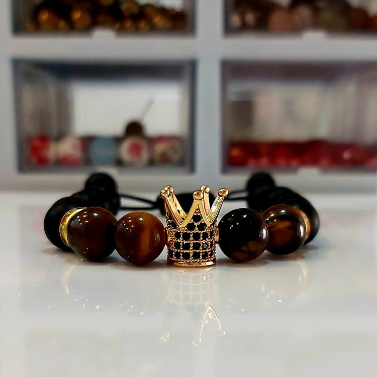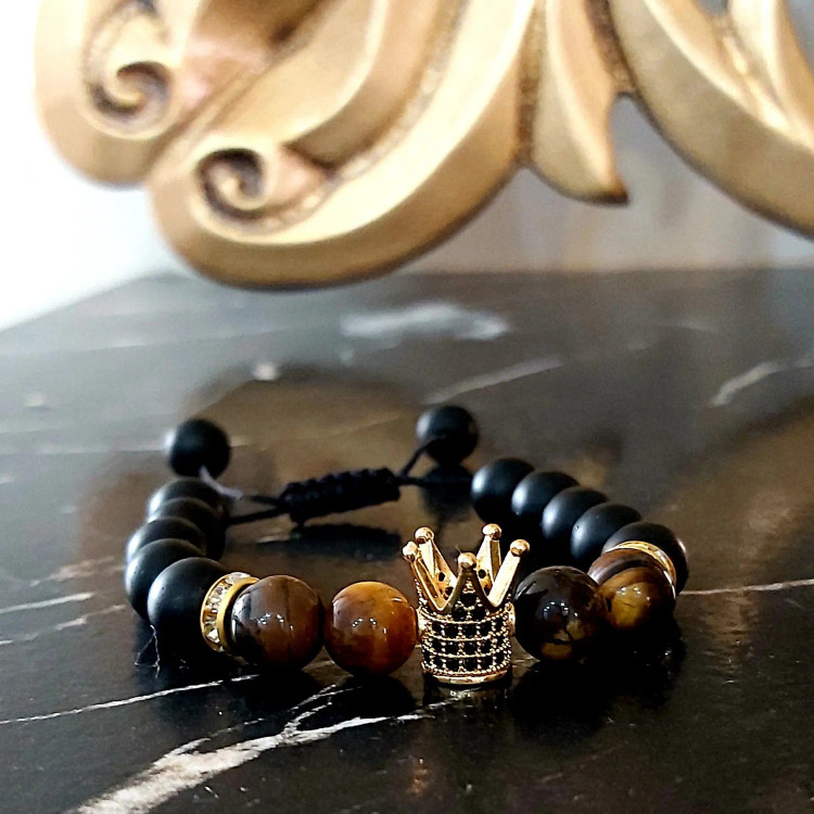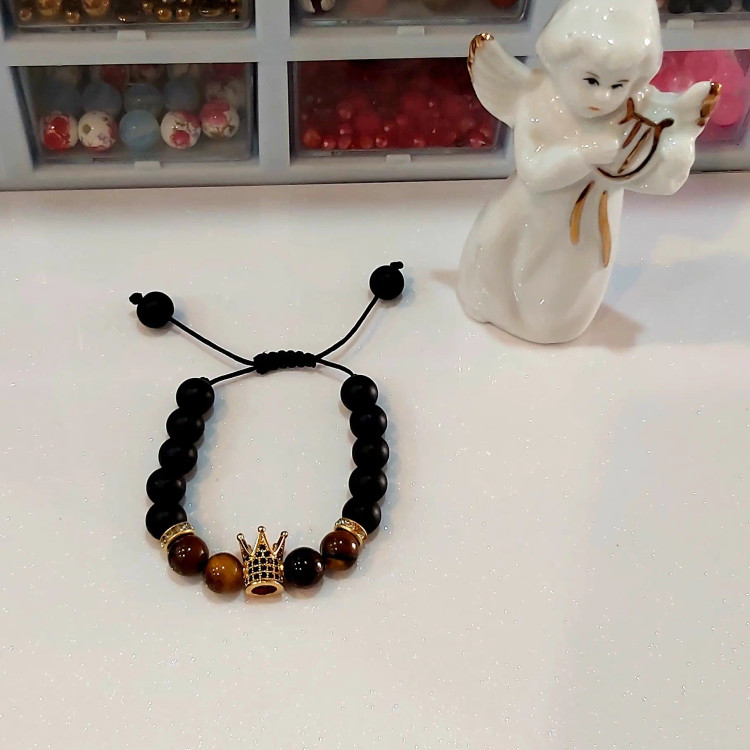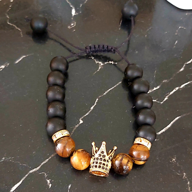 این دستبند از سنگ چشم ببر و اونیکس مات و گوی سوارسکی مدل تاج و رینگ نگین دار درست شده و دستبند بصورت گره کشویی جهت راحتی استفاده و فیکس کردن دور مچ دست درست شده است مناسب جهت هدیه دادن به عزیزانتان 🎁