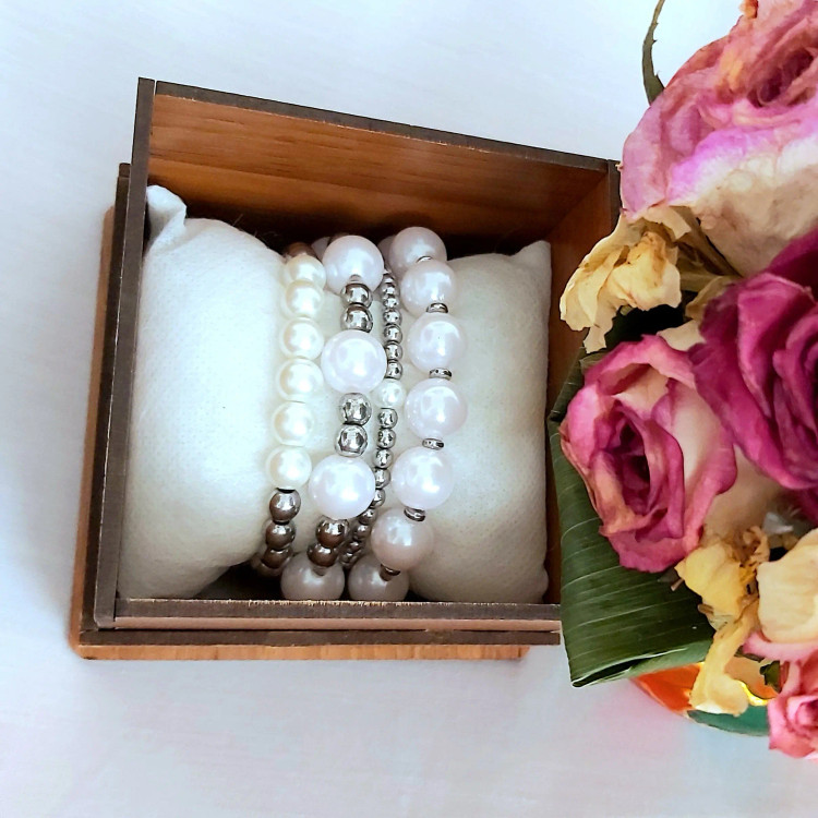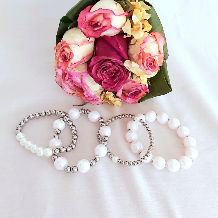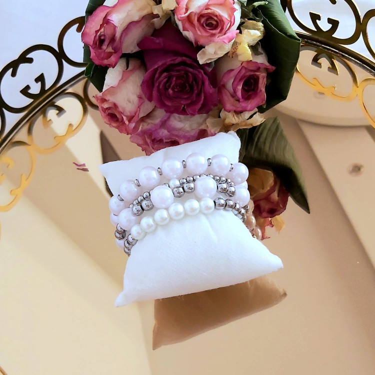 ست دستبند از چهار دستبند که همگی کشی میباشد از مروارید سنگی در سایزهای مختلف و سنگ حدید گرد و واشری نقره ای درست شده است که همگی رنگ ثابت هستن. مناسب هدیه دادن 🎁 مناسب خانم ها و دختران شیک پوش و لاکچری و خاص پسند 🙋🏻♀️👌 مناسب کسانی که طرفدار زیورآلات رنگ ثابت و مرواریدی هستن🤩 ⚜ لطفا بعد از ثبت سفارش دور مچ تان را با متر بصورت کیپ اندازه بگیرید و بهم اعلام کنيد بصورت کیپ بگید چون خودم دو سانت اضافه میگیرم براتون