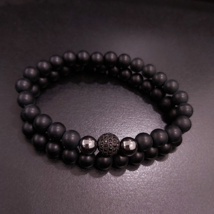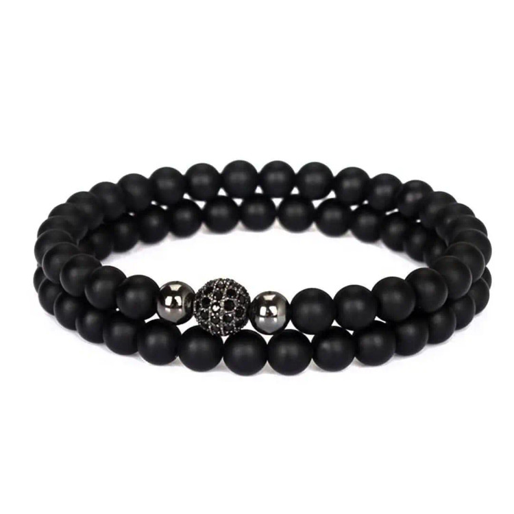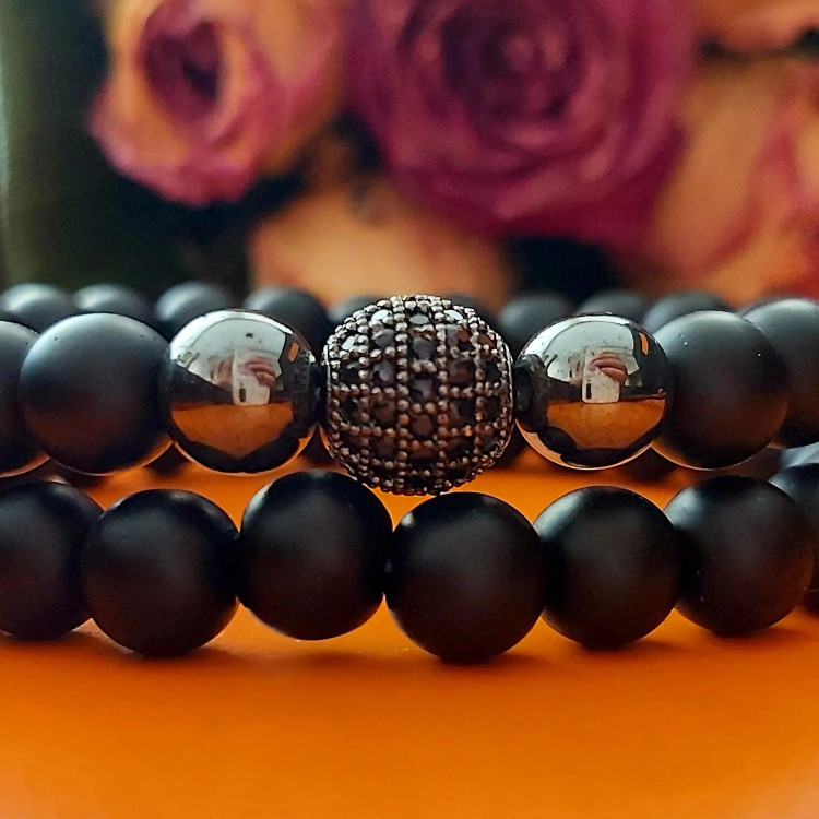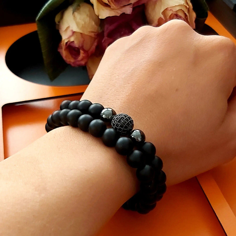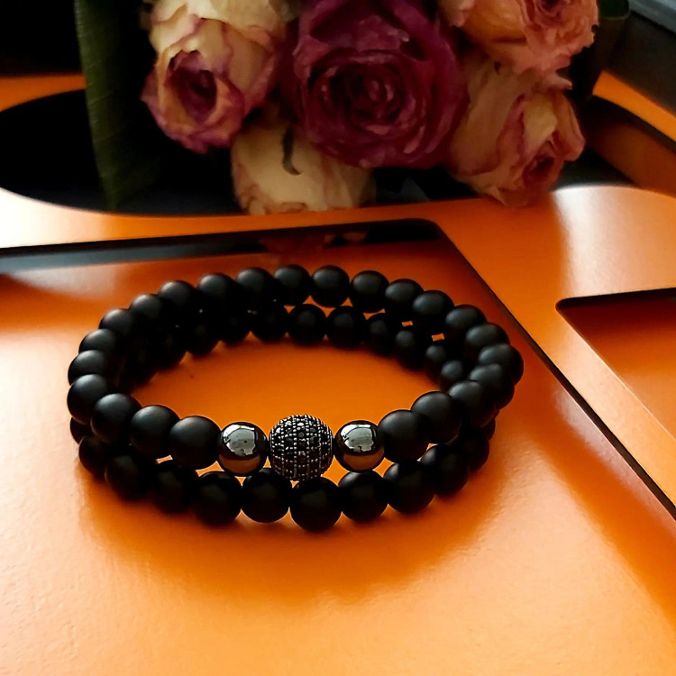 دستبند ست از دو دستبند کشی که یکی اونیکس مشکی مات و دیگری سنگ اونیکس و گوی سوارسکی نگین دار و دو سنگ حدید دودی درست شده است. اسپرت و جذاب و مناسب هدیه دادن 🎁و پسران و آقایون شیک پوش و مشکل پسند🧔🏻