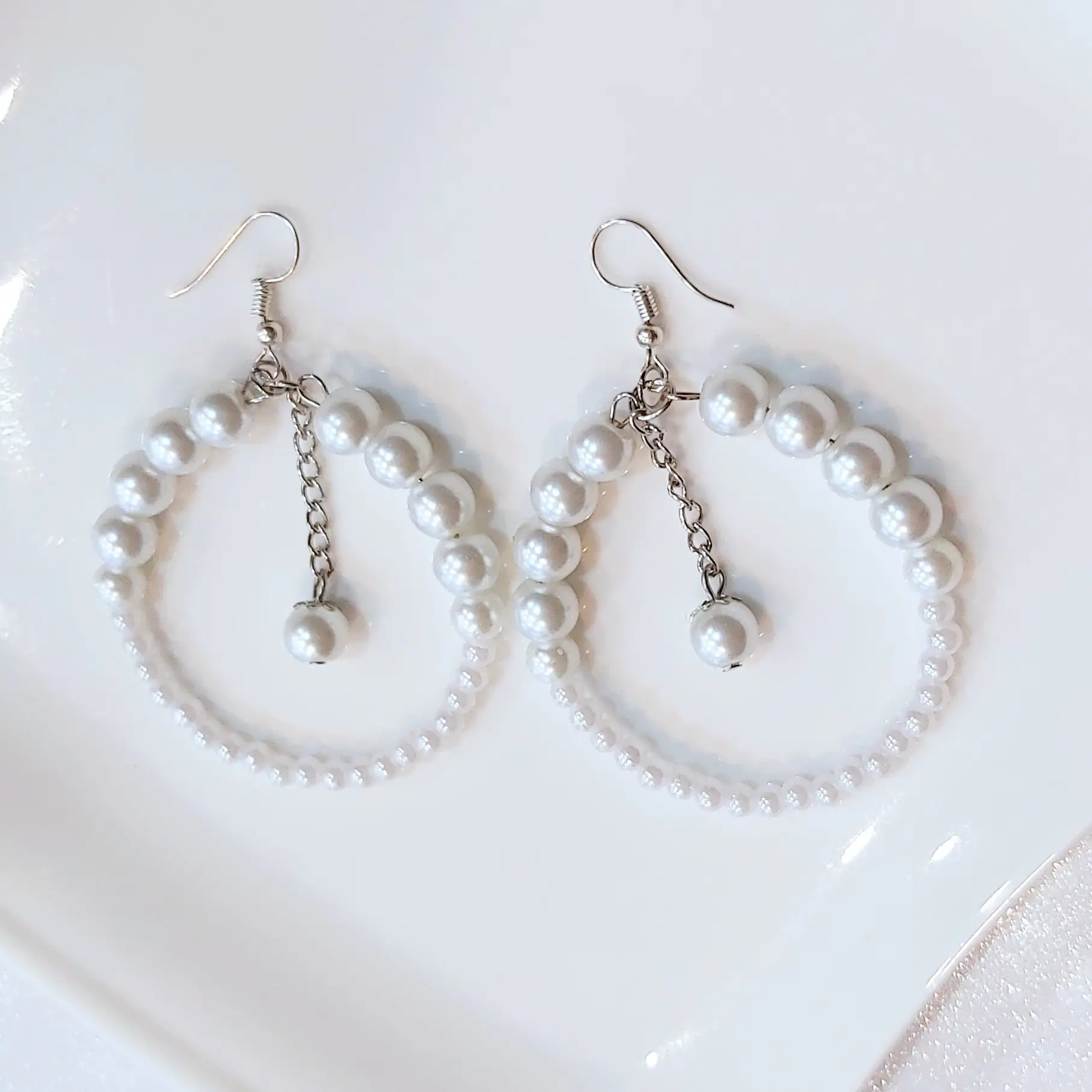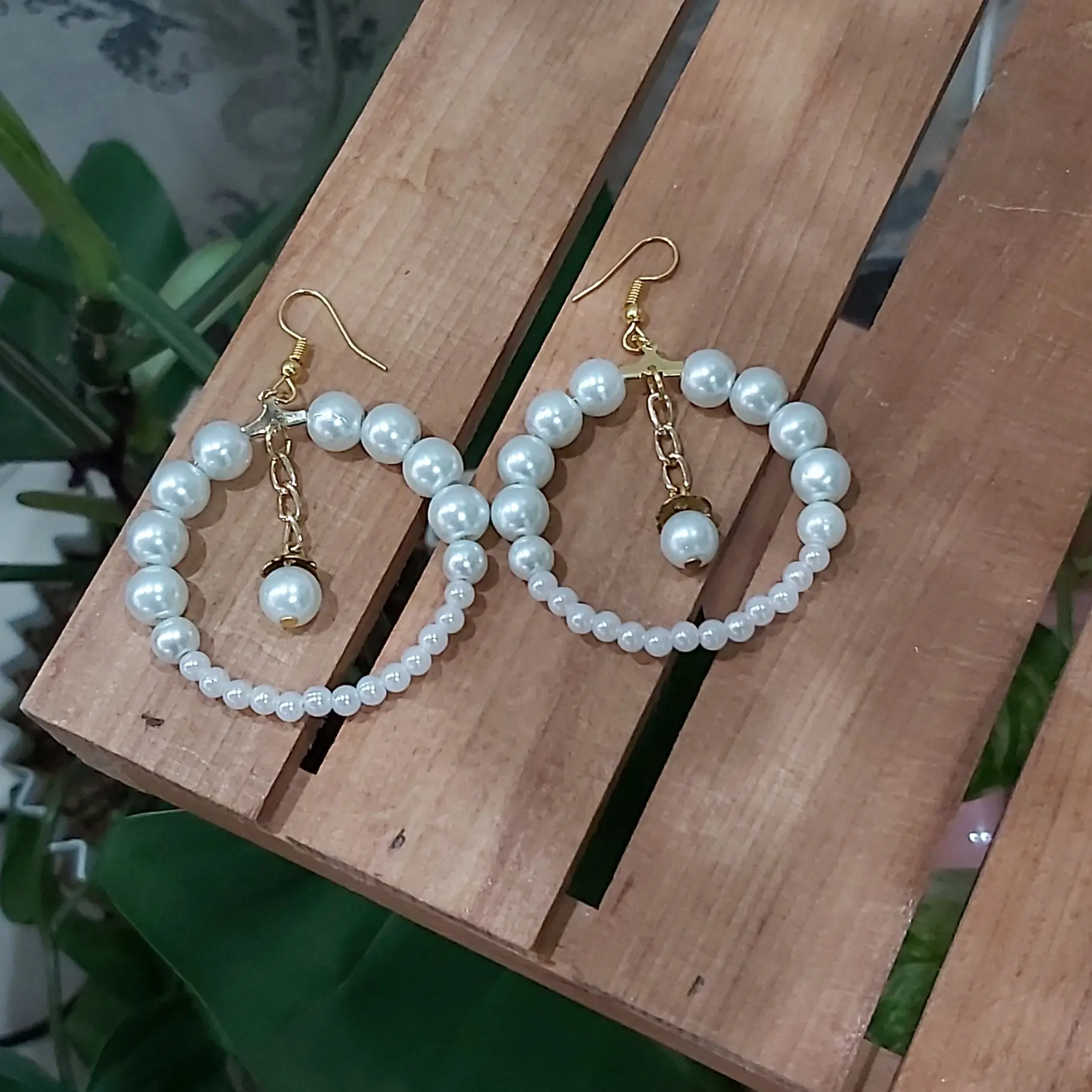 گوشواره مرواریدی حلقه ای گرد سفید و طلایی آویز دار