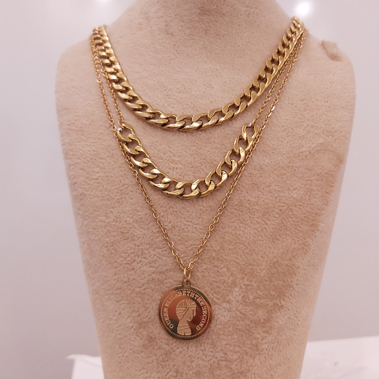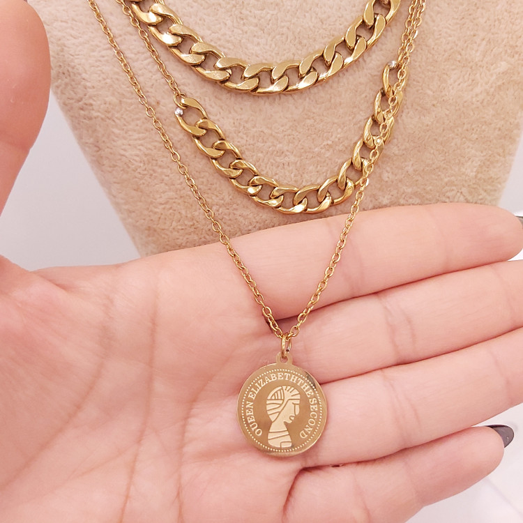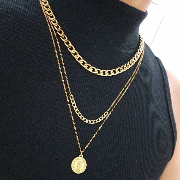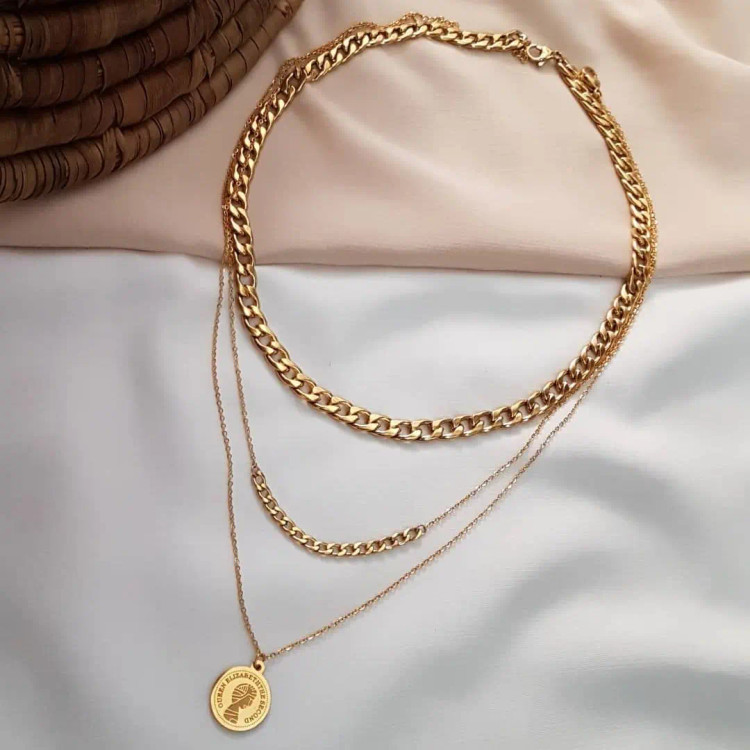 گردنبند کارتیه سه لاین از یه ردیف کارتیه استیل و یه ردیف زنجیر دیپلمات و کارتیه و یه ردیف زنجیر دیپلمات با آویز سکه الیزابت استیل درست شده است که همگی رنگ ثابت هستن 💯 مناسب جهت هدیه دادن 🎁 مناسب خانم ها و دختران شیک پوش و لاکچری و خاص پسند 🙋🏻♀️👌