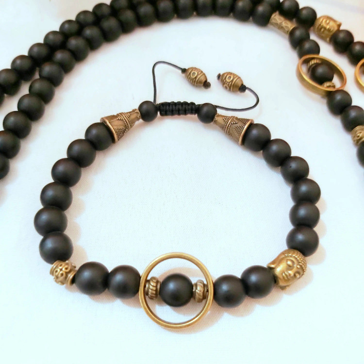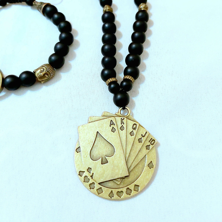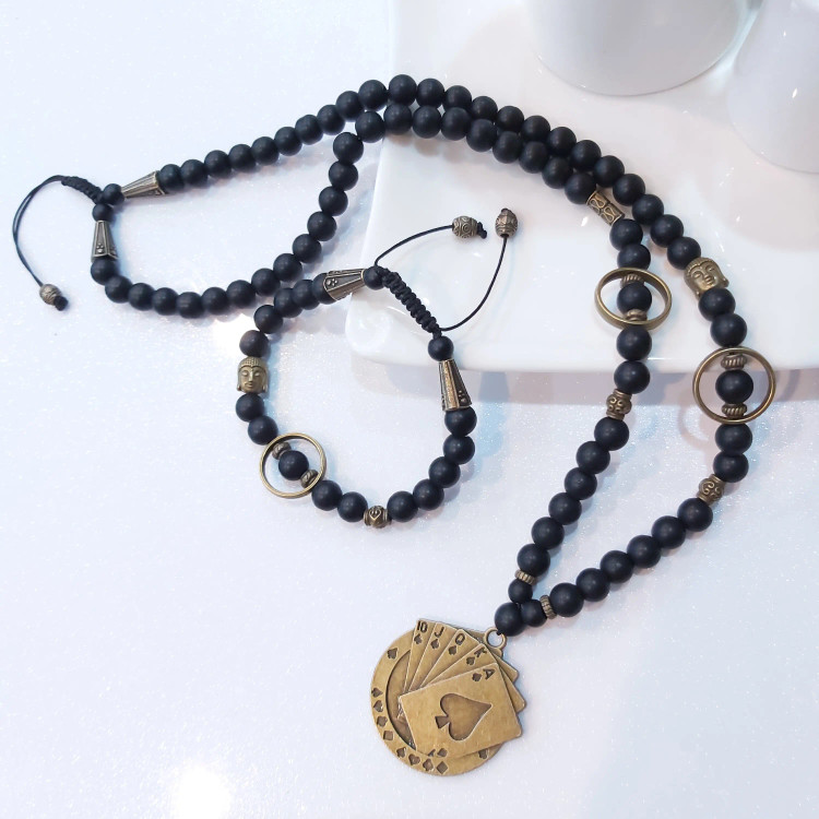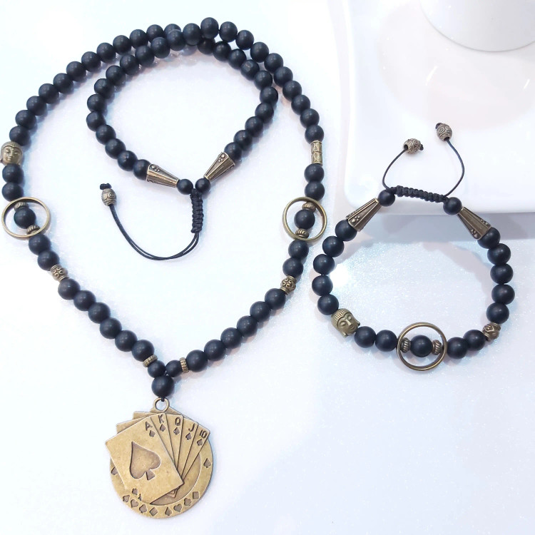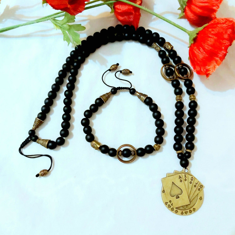 ست شامل گردنبند و دستبند سنگ اونیکس و خرجکارهای مختلف برنزی و پلاک آویز پیک پاسور درست شده است. بسیار شیک و جذاب برای پسران خاص پسند 🧑و آقایان خوش ذوق🧔 و هدیه دادن🎁 دستبند و گردنبند دارای گره کشویی جهت راحتی استفاده و فیکس کردن دور مچ دست و کوتاه و بلند کردن گردنبند میباشد.⚜لطفا دور مچ تان را با متر بصورت کیپ اندازه بگیرید و بهم اعلام کنيد بصورت کیپ بگید چون خودم دو سانت اضافه میگیرم براتون