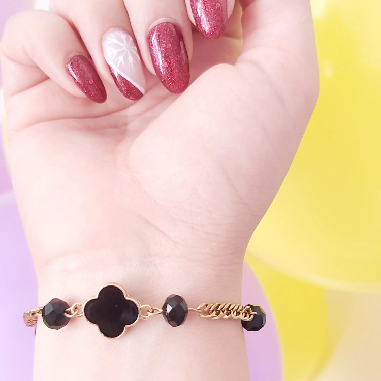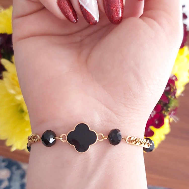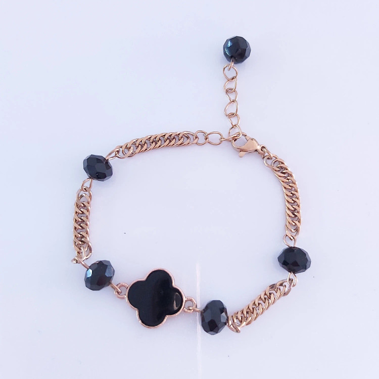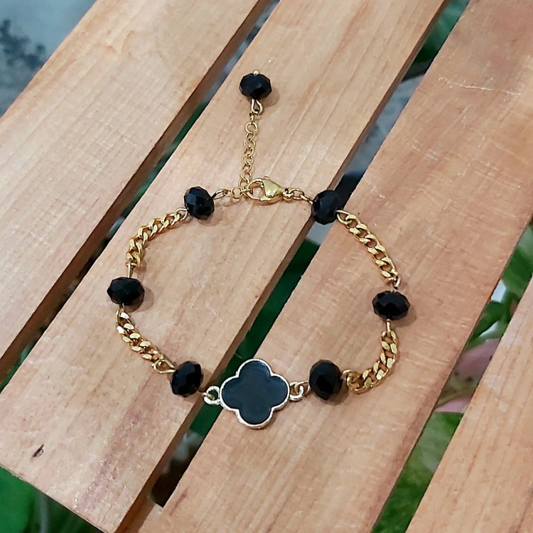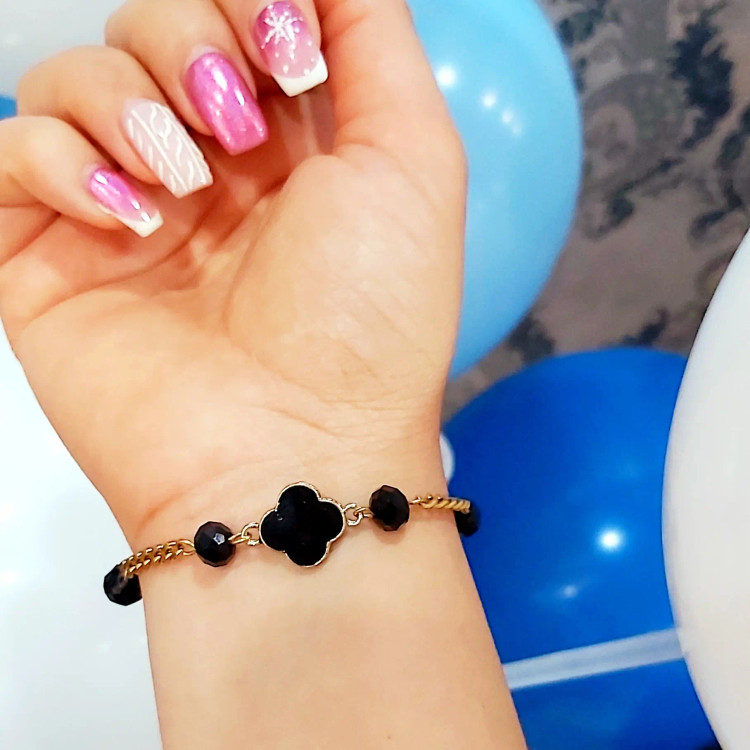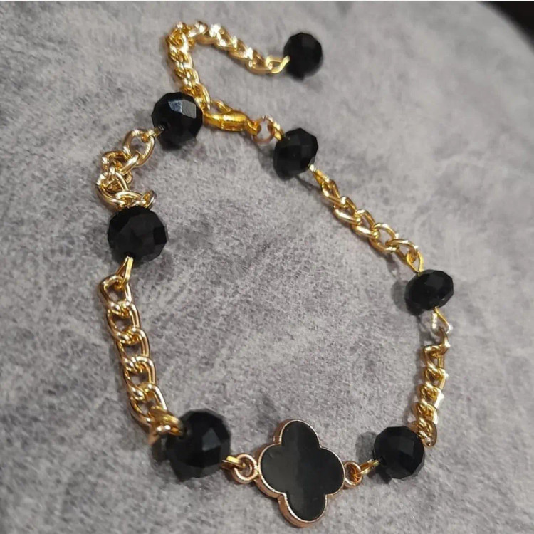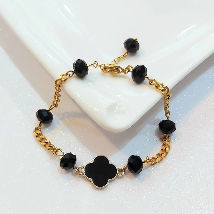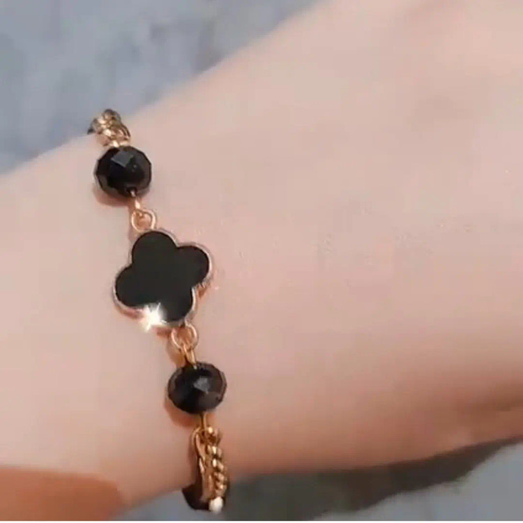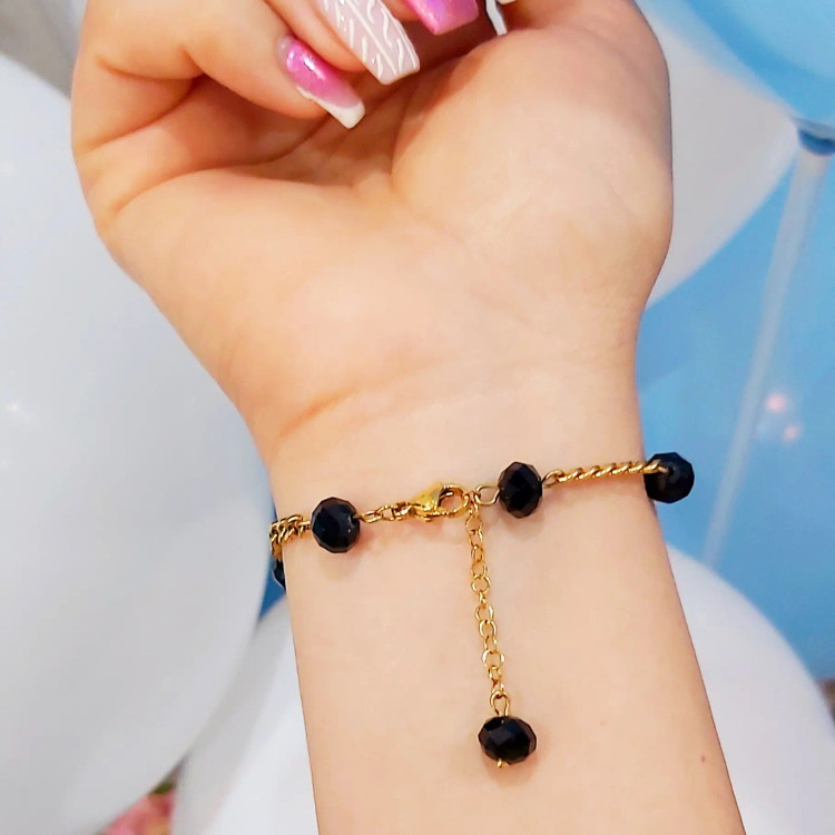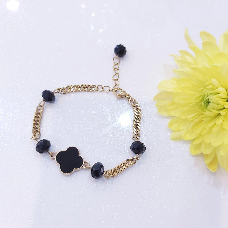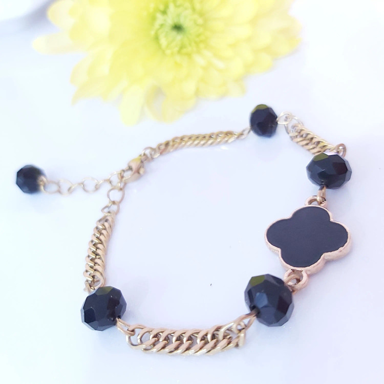دستبند از کریستال مشکی و پلاک ونکلیف مشکی و زنجیر استیل و قفل و حلقه و اتصالات استیل که همگی رنگ ثابت هستن درست شده است. مناسب هدیه دادن 🎁 مناسب خانم ها و دختران شیک پوش و خوش سلیقه بخاطر طلایی و مشکی بودن دستبند با همه رنگ لباسی قابل ست کردن است👌 قابل سفارش در رنگ های مختلف 🌈