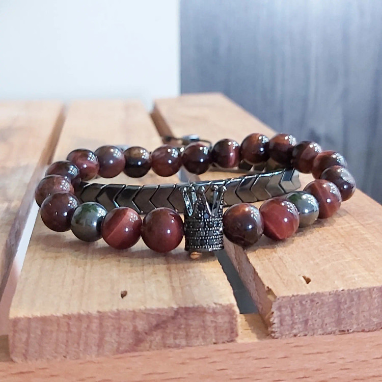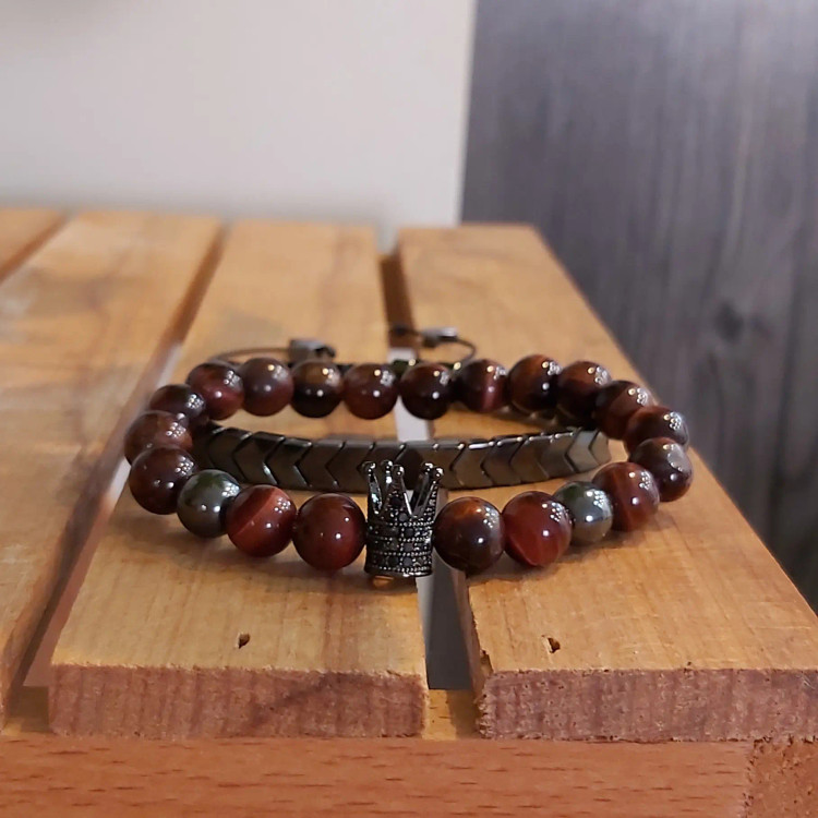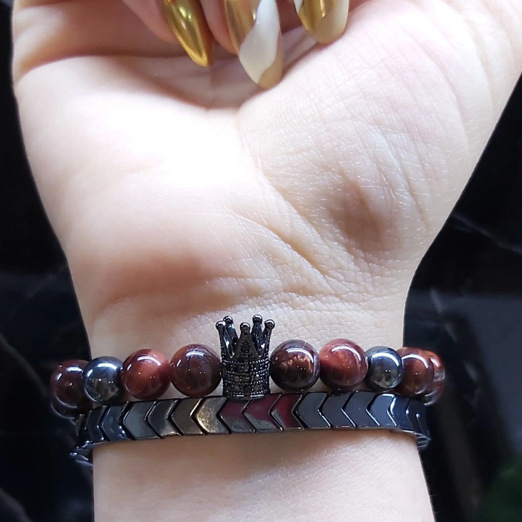 ست دستبند سنگ چشم شاهین از دو دستبند که یکی که دارای تاج سوارسکی میباشد، کشی میباشد و دیگری که از سنگ حدید دودی فلشی درست شده است بصورت گره کشویی میباشد. مناسب هدیه دادن 🎁 مناسب آقایان و پسران خوش پوش و اسپرت و لاکچری 🙋🏻♂️ نیازی به موجودی گرفتن نیس و با خیال راحت خرید بزنید و بعد از ثبت سفارش اندازه دور مچ تان را با متر بصورت کیپ اندازه بگیرید و بهم اعلام کنید