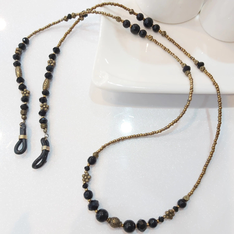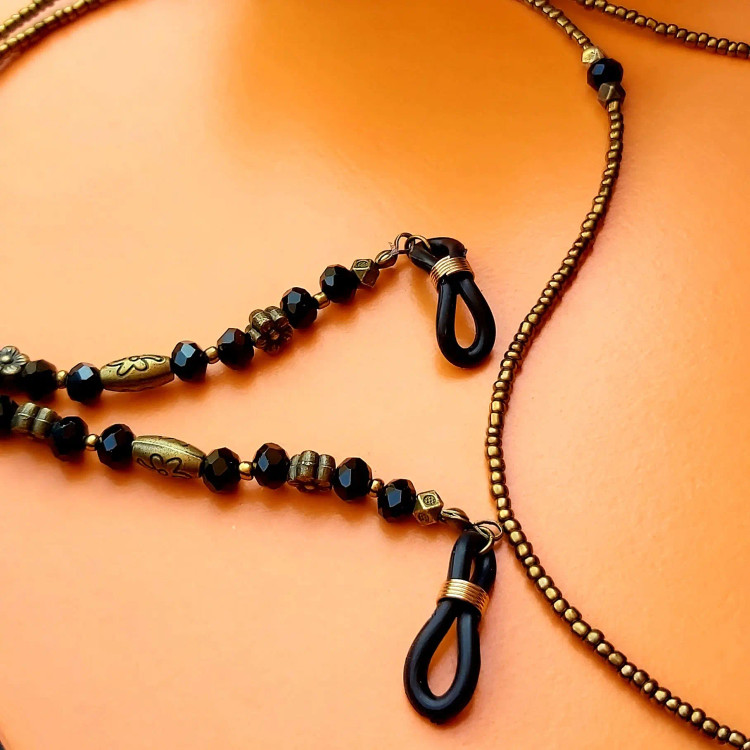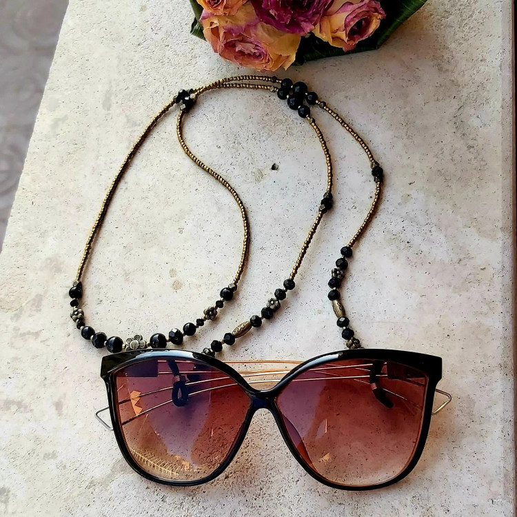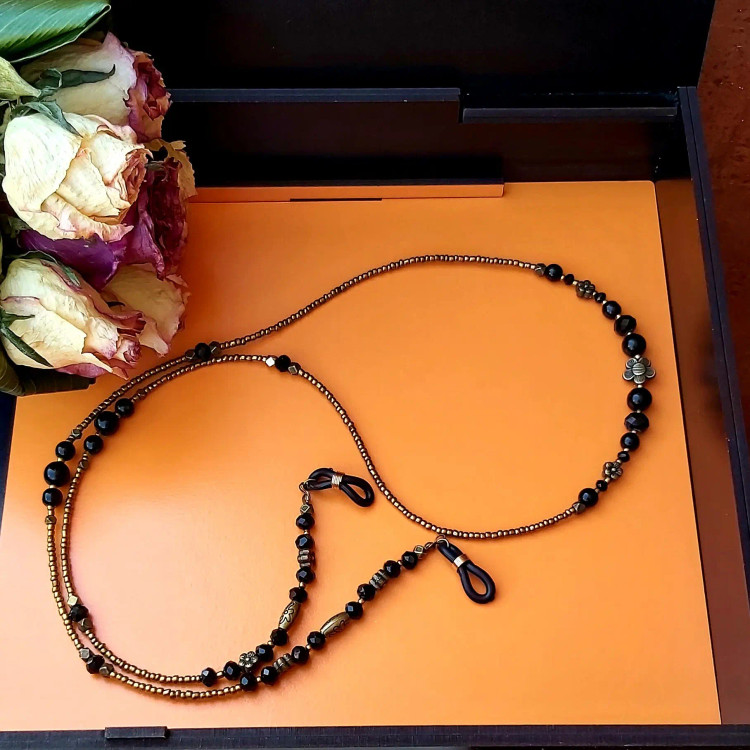 بند عینک از منجوق و کریستال و سنگ اونیکس مشکی براق و خرجکارهای مختلف برنزی درست شده است. ⚜️ طول بند عینک ها 80 الی 86 سانتیمتر ⚜️ بند عینک جذاب خاص برا خانم ها و دختران شیک پوش و لاکچری و خاص پسند 🙋🏻♀️ تو این روزهای گرم، عینک دودی 😎 جزو واجباته و برای عینک هاتون یه اکسسوری خاص و لاکچری تهیه کنید👍🏻 نیازی به موجودی گرفتن نیس و با خیال راحت خرید بزنید