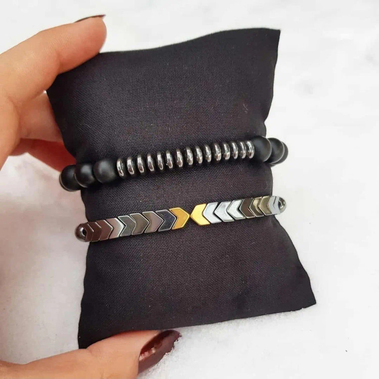 ست دستبند از دو دستبند کشی که یکی از اونیکس مشکی مات و حدید واشری درست شده و دستبند دیگری از حدید فلشی دودی و طلایی در جلوی دستبند و حدید گرد دودی در پشت دستبند درست شده است. ست دستبند کاملا رنگ ثابت میباشد.💯 مناسب جهت هدیه دادن به عزیزانتان 🎁 مناسب آقایان و پسران خوش پوش و خوش سلیقه 🙋🏻♂️