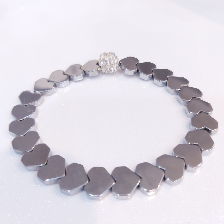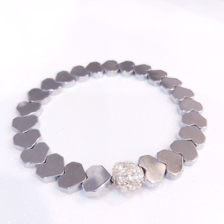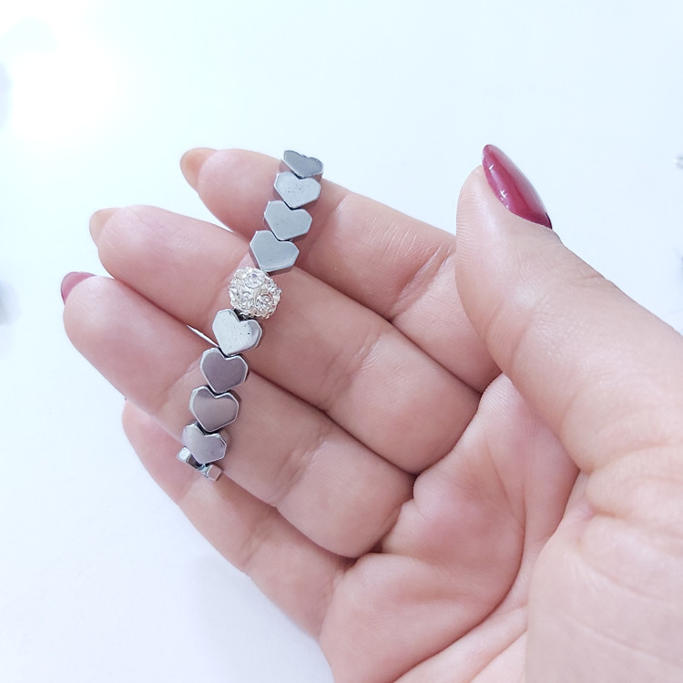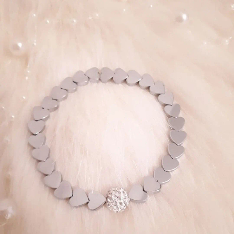 دستبند از سنگ حدید طرح قلب نقره ای و گوی نگین دار سفید درست شده است که بصورت کشی میباشد. دستبند رنگ ثابت میباشد.💯 مناسب خانم ها و دختران شیک پوش و لاکچری و خاص پسند 🙋🏻♀️