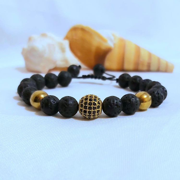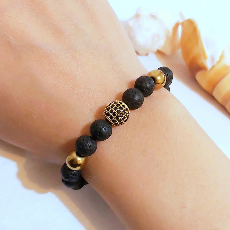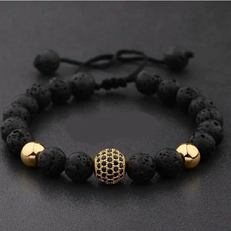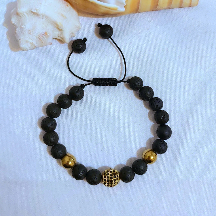 دستبند مردانه سنگ لاوا گوی سوارسکی حدید گرد طلایی رنگ ثابت اکسسوری دستساز مردانه