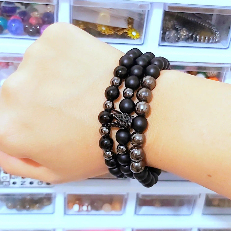ست دستبند مردانه سنگ حدید دودی و اونیکس مشکی اکسسوری دستساز پسرانه