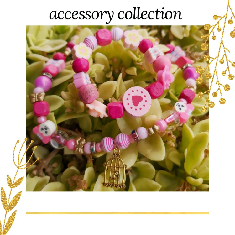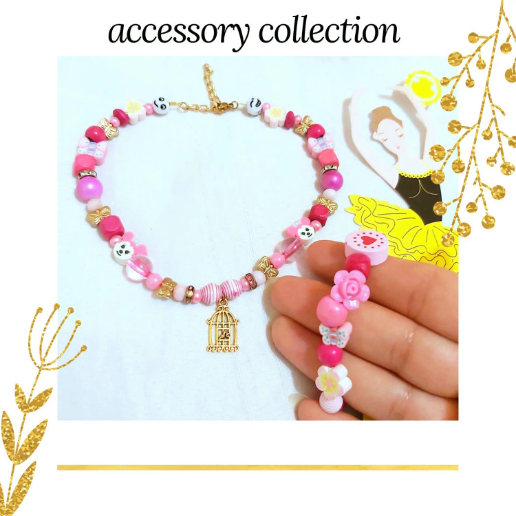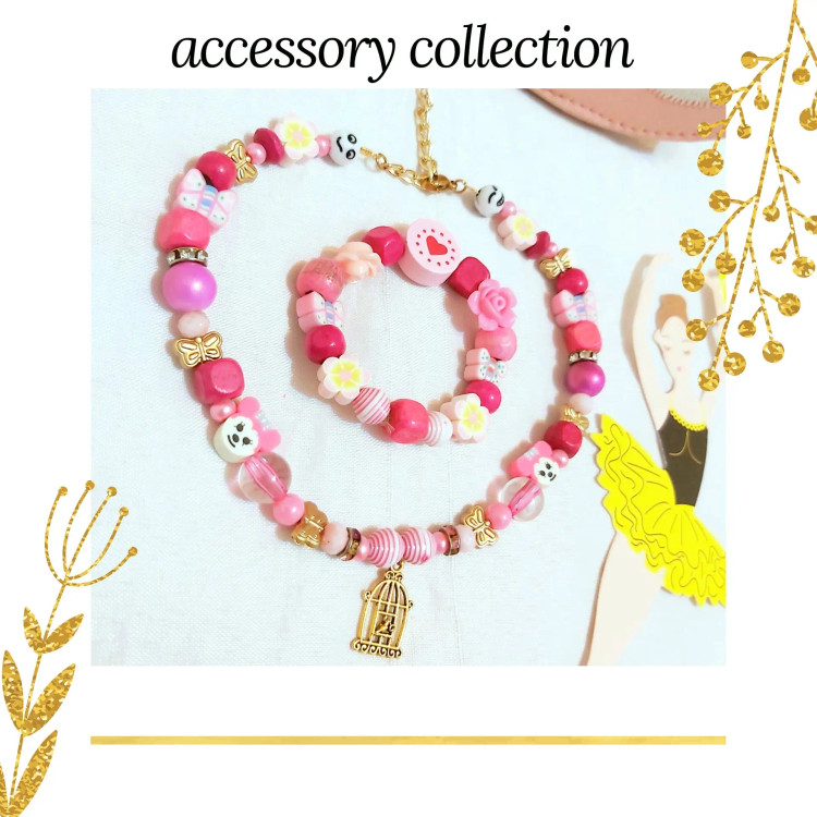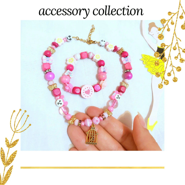 ست گردنبند و دستبند از مهره های چوبی و شیشه ای وطرح آبنباتی و گل های پلاستیکی و رینگ های هفت رنگ و طلایی و ایموجی (شکلک) و فیموهای مختلف پروانه و میکی موس و گل با پلاک برنجی قفس پرنده درست شده است. گردنبند بصورت زنجیر و قفل رنگ ثابت و دستبند کشی متناسب با سایز دلخواه شما مناسب دختران و هدیه دادن 🎁