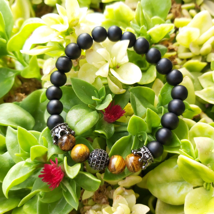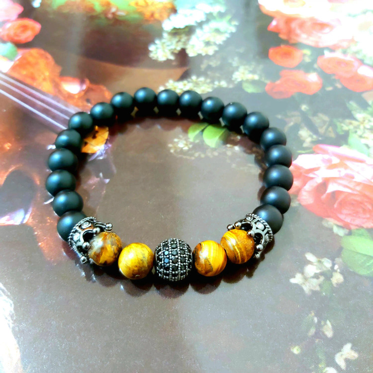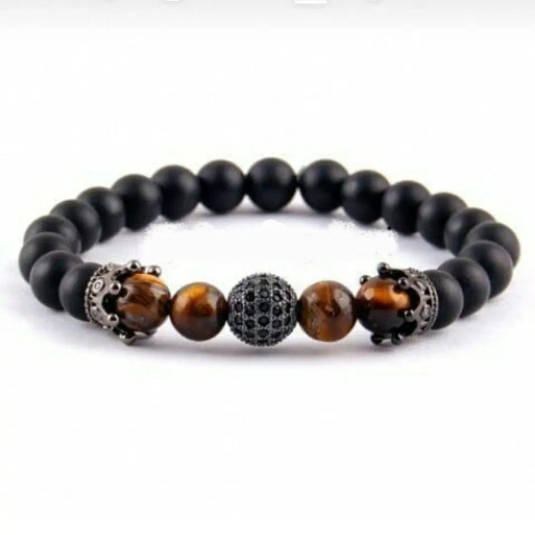 دستبند از سنگ چشم ببر و اونیکس مشکی مات و گوی سوارسکی نگین دار و دو تا نیم تاج سوارسکی نگین دار دودی درست شده است که بصورت کشی میباشد دستبند کاملا رنگ ثابت است مناسب جهت هدیه دادن و آقایون و پسران خاص پسند