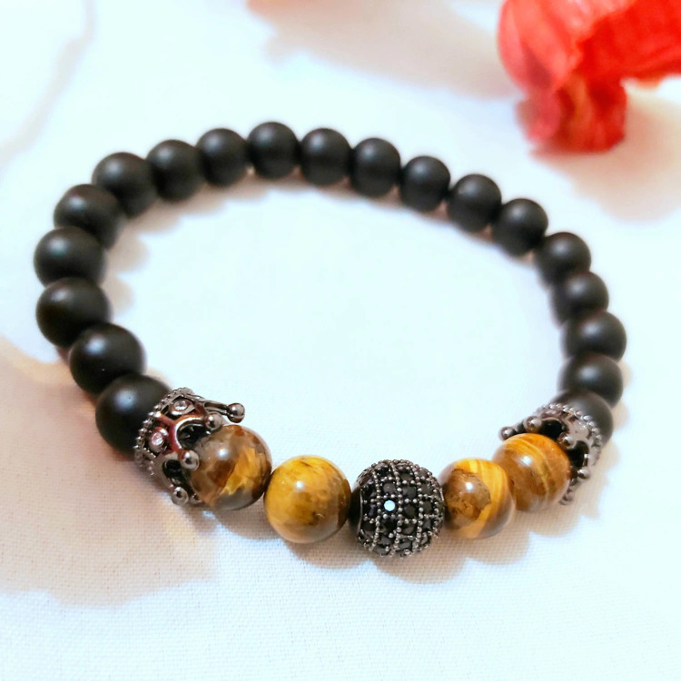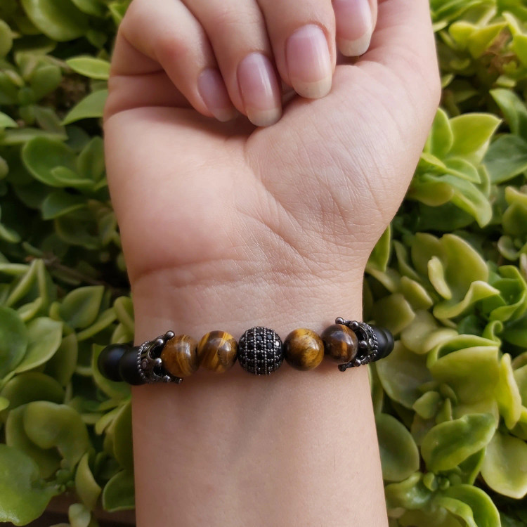 دستبند سنگ چشم ببر و اونیکس گوی و تاج سوارسکی رنگ ثابت اکسسوری دستساز مردانه