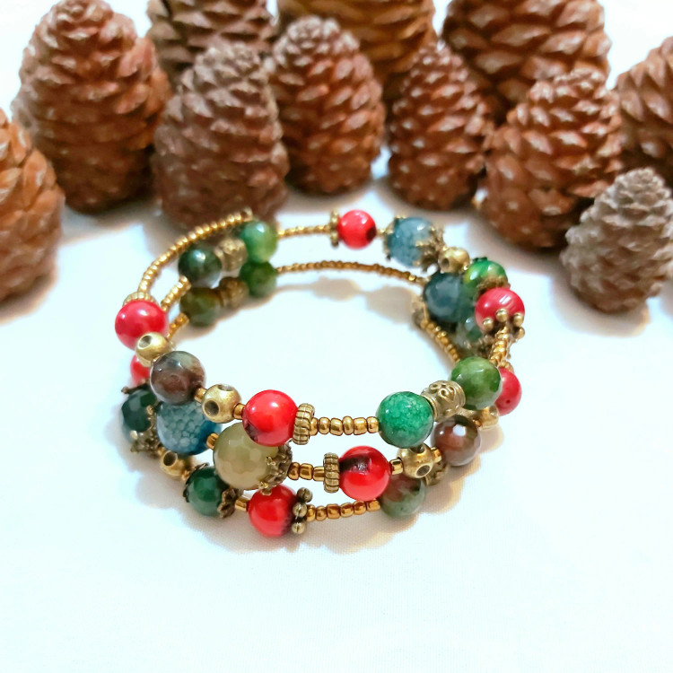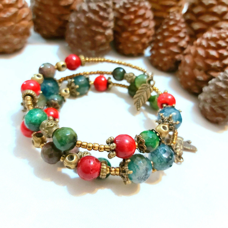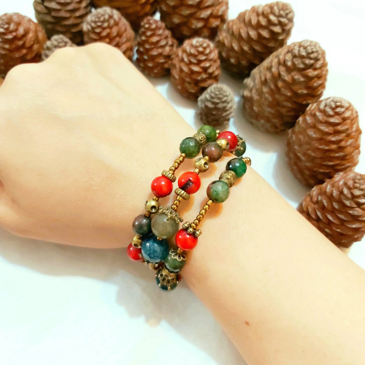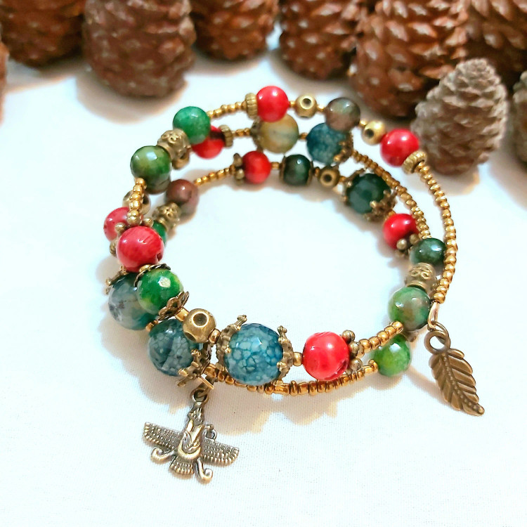 دستبند فنری سه دور از سنگ های تورمالین و سنگ جید رگه دار و سنگ مرجان با خرجکارهای مختلف برنزی و منجوق برنزی و آویزهای برگ و فروهر درست شده است. مناسب بانوان و دختران شیک پوش👸🏻 و لاکچری و هدیه دادن🎁 مناسب متولدین مهر و اسفند ماه🙋🏻♀️