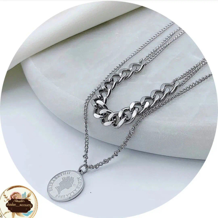 گردنبند دو تایی شامل زنجیر دیپلمات استیل و زنجیر کارتیر استیل و سکه الیزابت و اتصالات و قفل و حلقه استیل میباشد که همگی رنگ ثابت هستن 💯 مناسب جهت هدیه دادن به عزیزانتان 🎁 مناسب خانم ها و دختران شیک پوش و لاکچری و خاص پسند 🙋🏻♀️👌 مناسب کسانی که طرفدار زیورآلات رنگ ثابت و نقره ای هستن