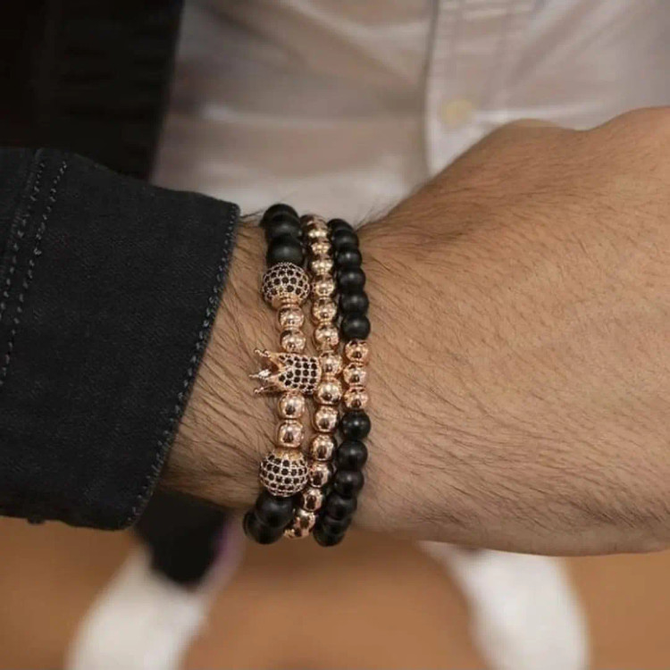 ست دستبند از سه دستبند کشی که یکی از حدید گرد طلایی درست شده و دیگری از تاج و گوی سوارسکی نگین دار اصل و دیگری از اونیکس مشکی و حدید طلایی درست شده است که همگی رنگ ثابت هستن 💯 مناسب جهت هدیه دادن 🎁 مناسب آقایان و پسران خوش پوش و اسپرت و لاکچری 🙋🏻♂️👌 نیازی به موجودی گرفتن نیس و با خیال راحت خرید بزنید و بعد از ثبت سفارش اندازه دور مچ تان را بصورت کیپ با متر اندازه بگیرید و بهم اعلام کنید تا دستبند متناسب با دور مچ تان آماده گردد 😊