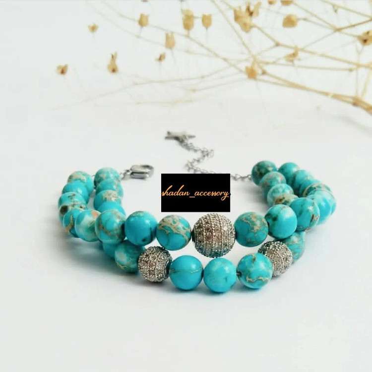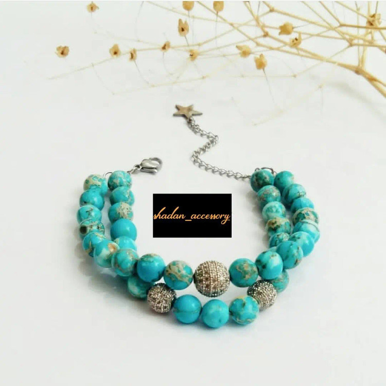 دستبند از دو لاین سنگ آفریقایی اصل و سه عدد گوی سوارسکی نگین دار اصل و آویز استیل ستاره و قفل و حلقه و اتصالات استیل درست شده است. ⚜️ مناسب خانم ها و دختران شیک پوش و لاکچری و خاص پسند 🙋🏻♀️ ⚜️ نیازی به موجودی گرفتن نیس و با خیال راحت خرید بزنید و بعد از ثبت سفارش اندازه دور مچ تان را با متر بصورت کیپ اندازه بگیرید و بهم اعلام کنید ⚜️ مناسب خانم هایی که طرفدار فیروزه هستند