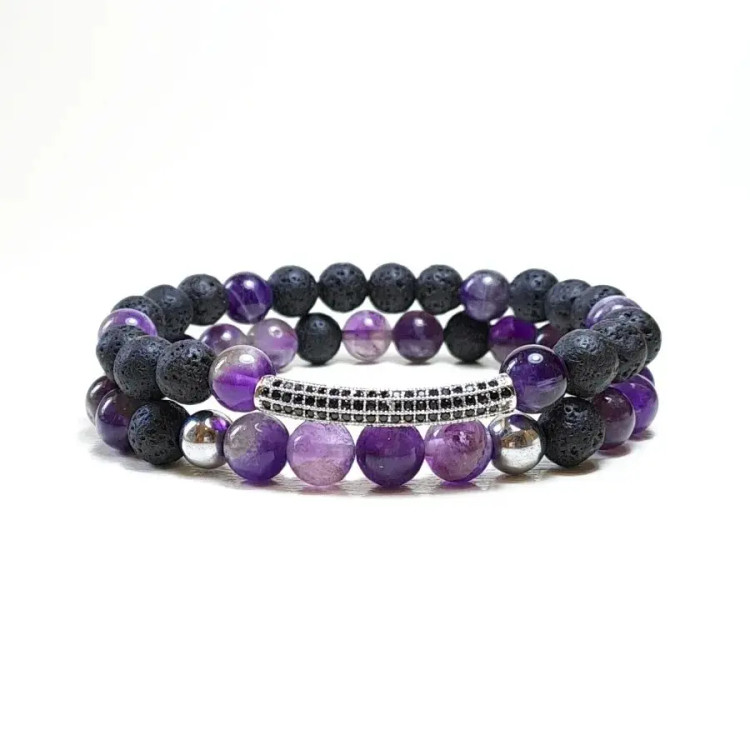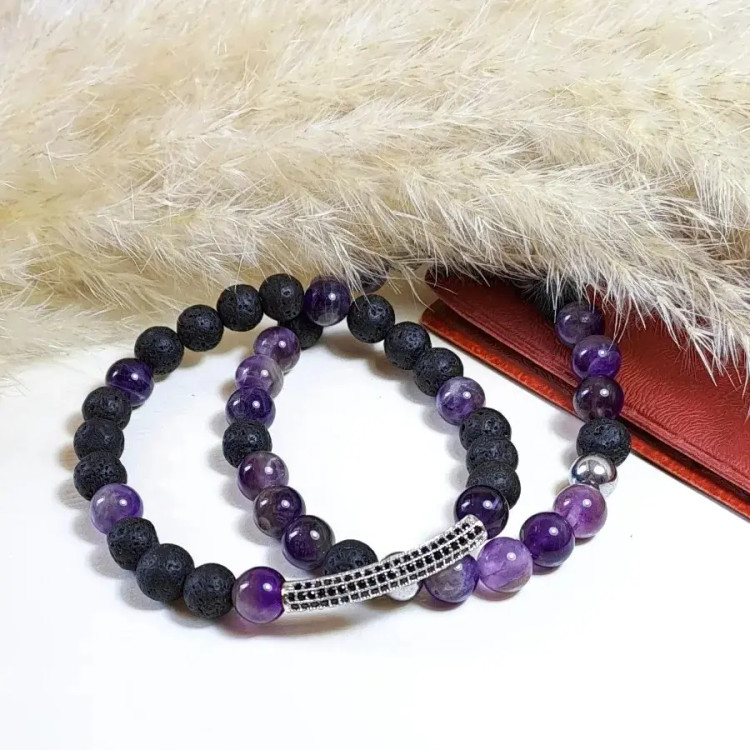 دستبند از سنگ آمیتیست اصل و سنگ لاوا ( سنگ آتشفشان )و سنگ حدید و پلاک سوارسکی درست شده است. ⚜ دستبند متناسب با دور مچ مشتری آماده و ارسال میگردد ⚜ مناسب آقایان و پسران شیک پوش و اسپرت ⚜ سنگ آمتیست خشم، طغیان، ترس، تشویق، نگرانى و اضطراب را از بین می برد. سنگ آميتيست اراده را تقویت می نماید .