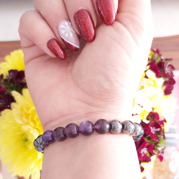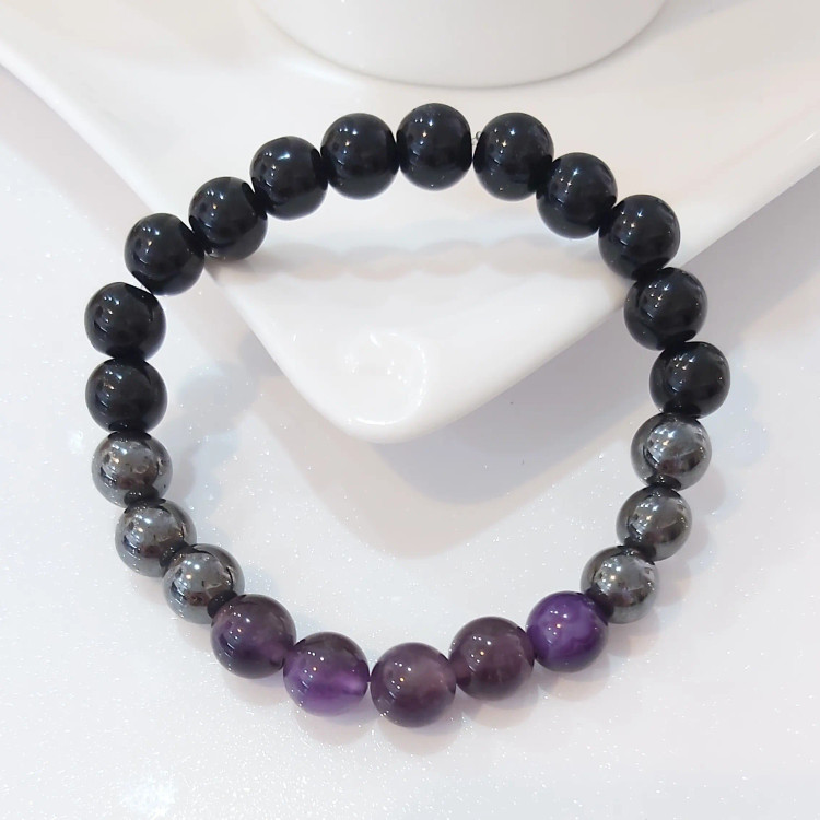 دستبند از سنگ آمیتیست اصل و سنگ حدید دودی و اونیکس براق درست شده است. ⚜ دستبند متناسب با دور مچ مشتری آماده و ارسال میگردد ⚜ هم مناسب خانم ها هم آقایان ⚜ سنگ آمتیست خشم، طغیان، ترس، تشویق، نگرانى و اضطراب را از بین می برد. سنگ آميتيست اراده را تقویت می نماید .