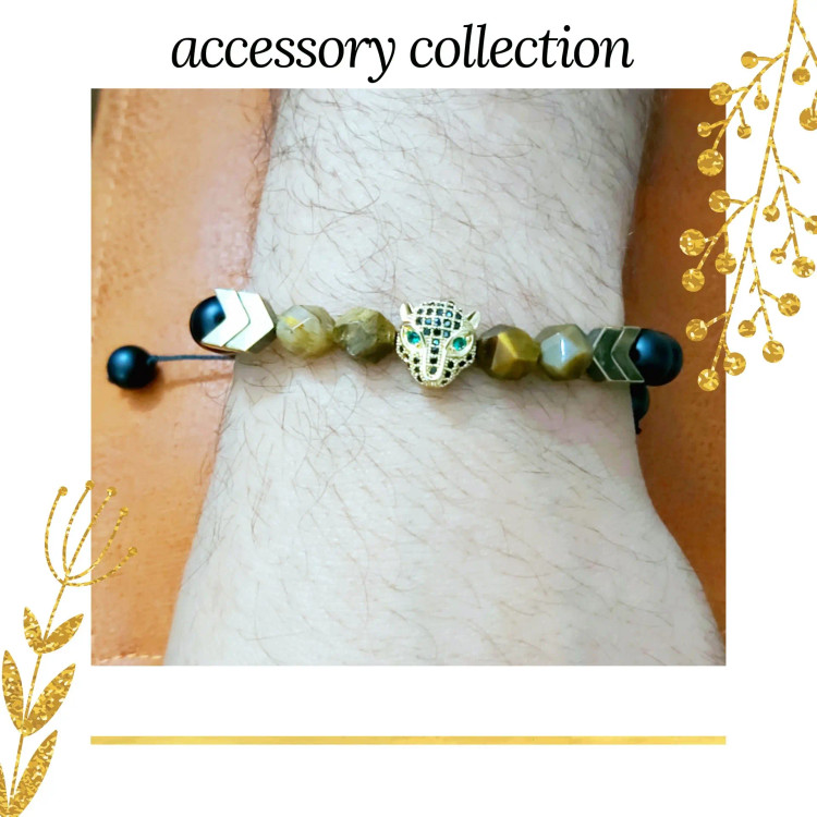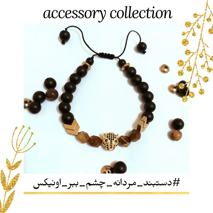دستبند از سنگ چشم ببر طرح تراش استار و حدید (هماتیت) واشری طلایی و حدید طرح فلش (پیکان) و اونیکس مشکی مات در سایزهای مختلف و ببر سوارسکی 🐅 درست شده است که همگی رنگ ثابت هستن و با گره کشویی جهت راحتی استفاده و فیکس کردن دور مچ دست استفاده شده است. مناسب مردان و پسران خاص پسند لاکچری🤵🏻♂️و مناسب هدیه دادن 🎁