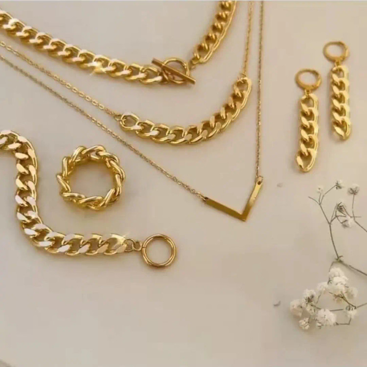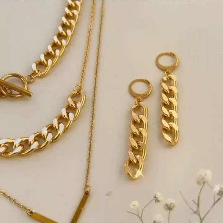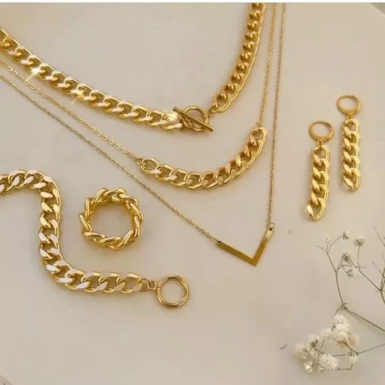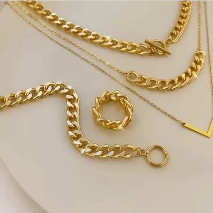 سرویس از دستبند و انگشتر و گوشواره و گردنبند سه ردیفه با پلاک 7 درست شده است که شامل زنجیر کارتیر استیل و زنجیر دیپلمات استیل و پلاک 7 استیل و گوشواره استیل و قفل تی و اتصالات استیل درست شده است. سرویس کاملا رنگ ثابت میباشد💯 مناسب جهت هدیه دادن به عزیزانتان 🎁 مناسب خانم ها و دختران شیک پوش و لاکچری و خاص پسند 🙋🏻♀️ مناسب کسانی که طرفدار زیورآلات کارتیر رنگ ثابت مشابه طلا هستن👌