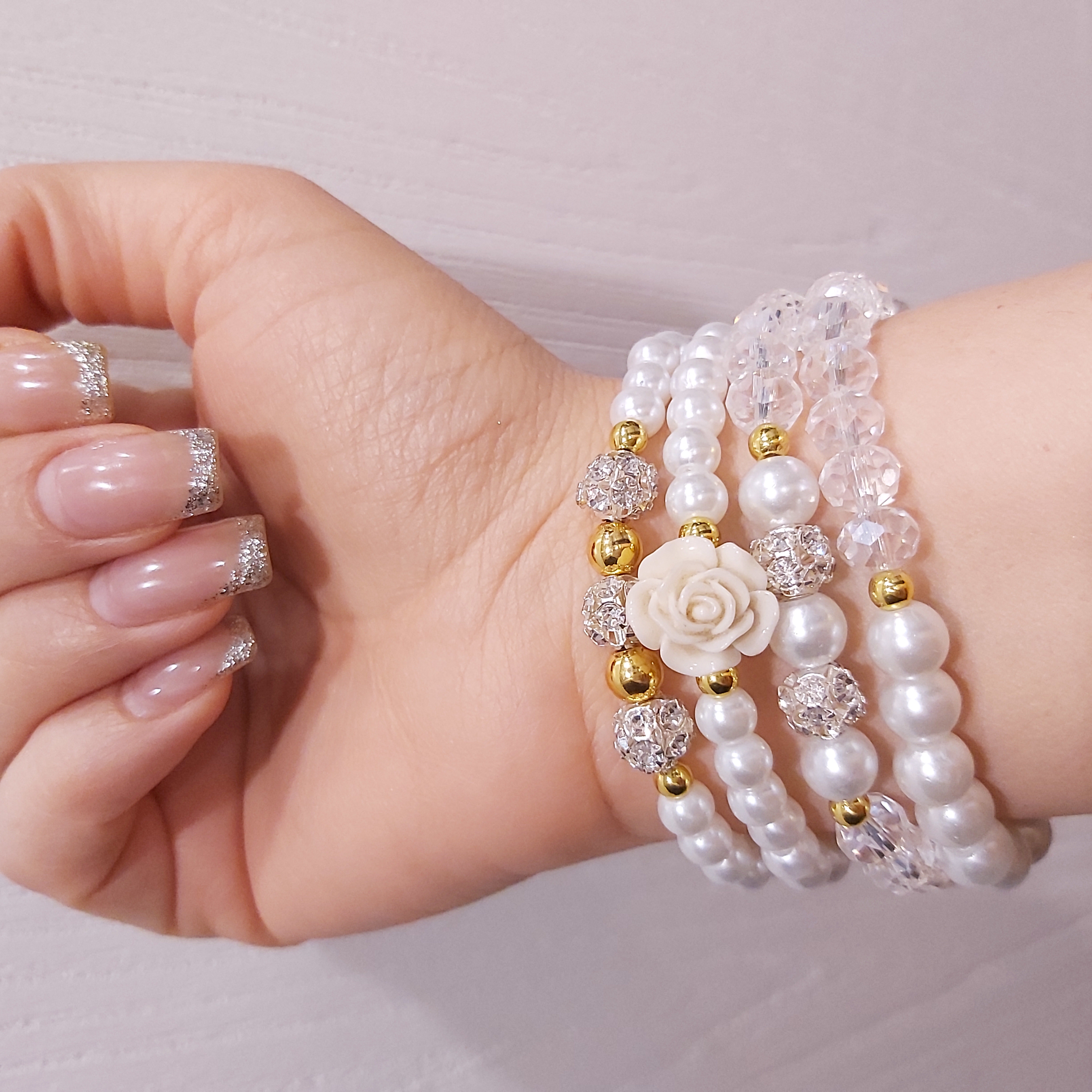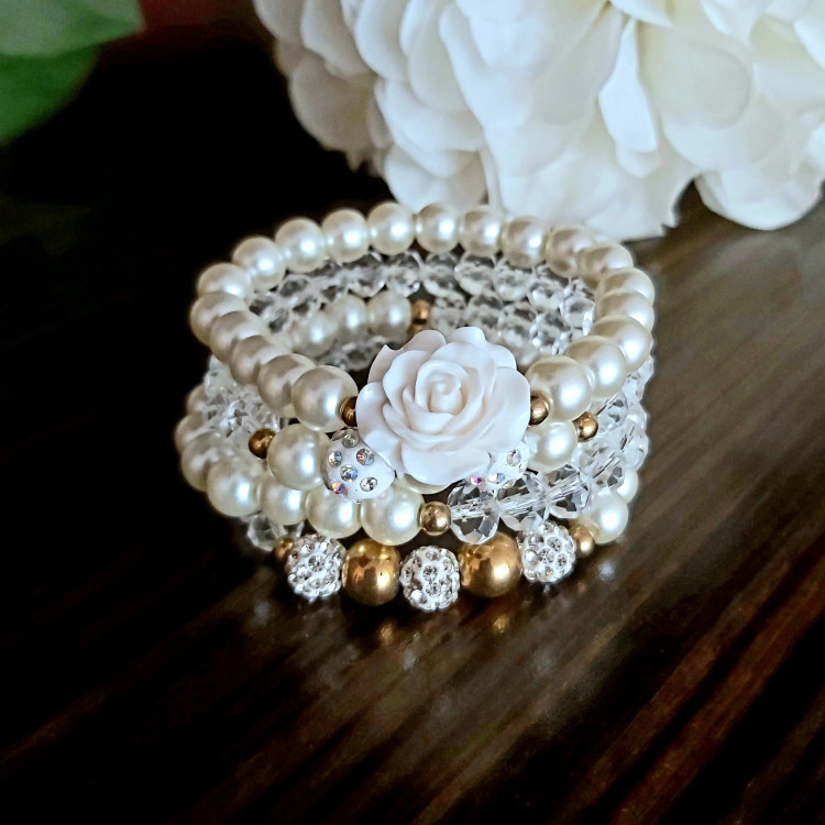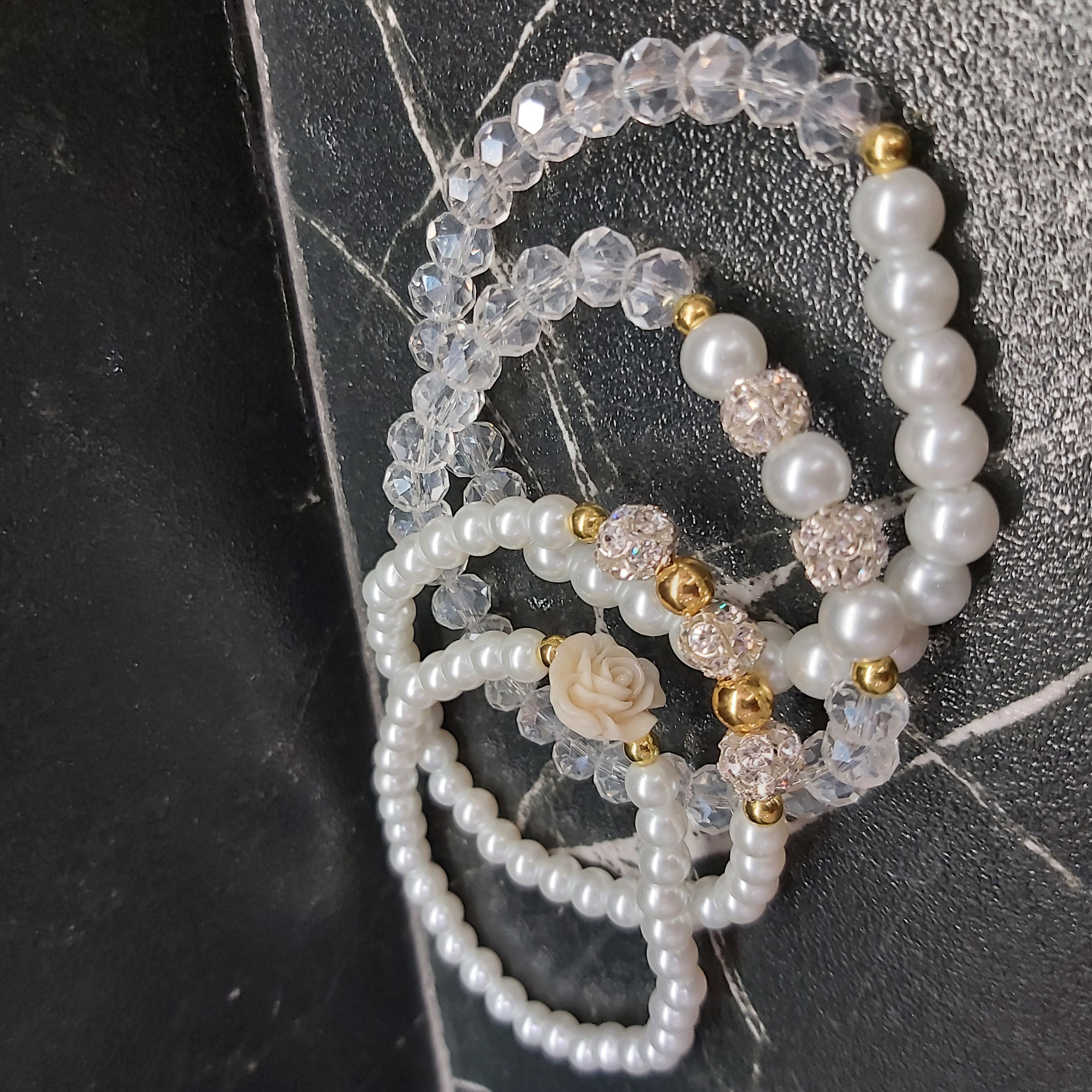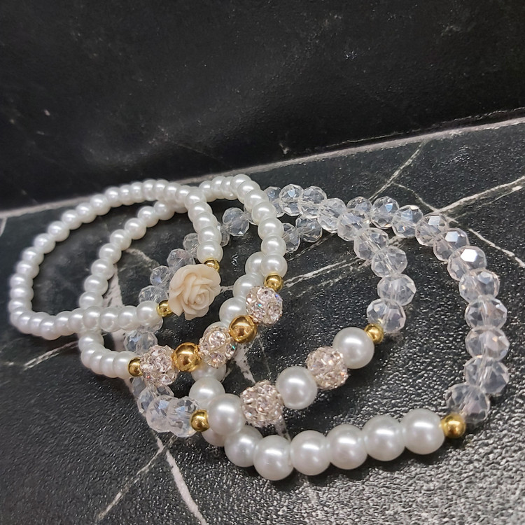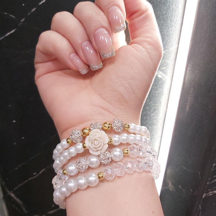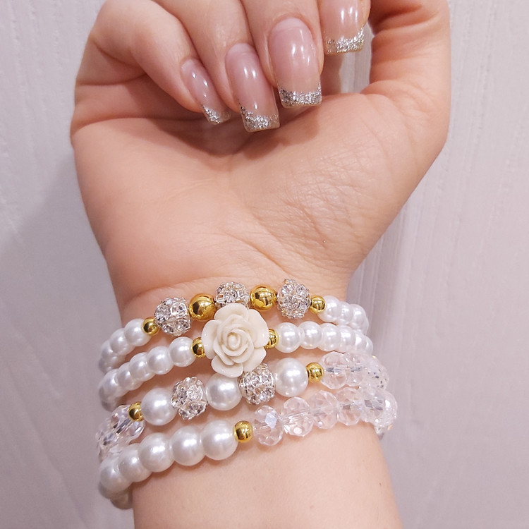 ست دستبند از چهار دستبند کشی که شامل مروارید سنگی و کریستال و گل سرامیکی و گوی نگین دار و حدید (هماتیت) طلایی گرد درست شده است که همگی رنگ ثابت هستن. مناسب هدیه دادن به عزیزانتان 🎁 مناسب خانم ها و دختران شیک پوش و لاکچری و خوش سلیقه که طرفدار زیورآلات و اکسسوری های مرواریدی و سفید هستن. فوق العاده رو دست هاتون زیبا هستش و بخاطر سفید بودن به همه رنگ لباس و مانتویی هم میاد و نمای قشنگی داره🤩