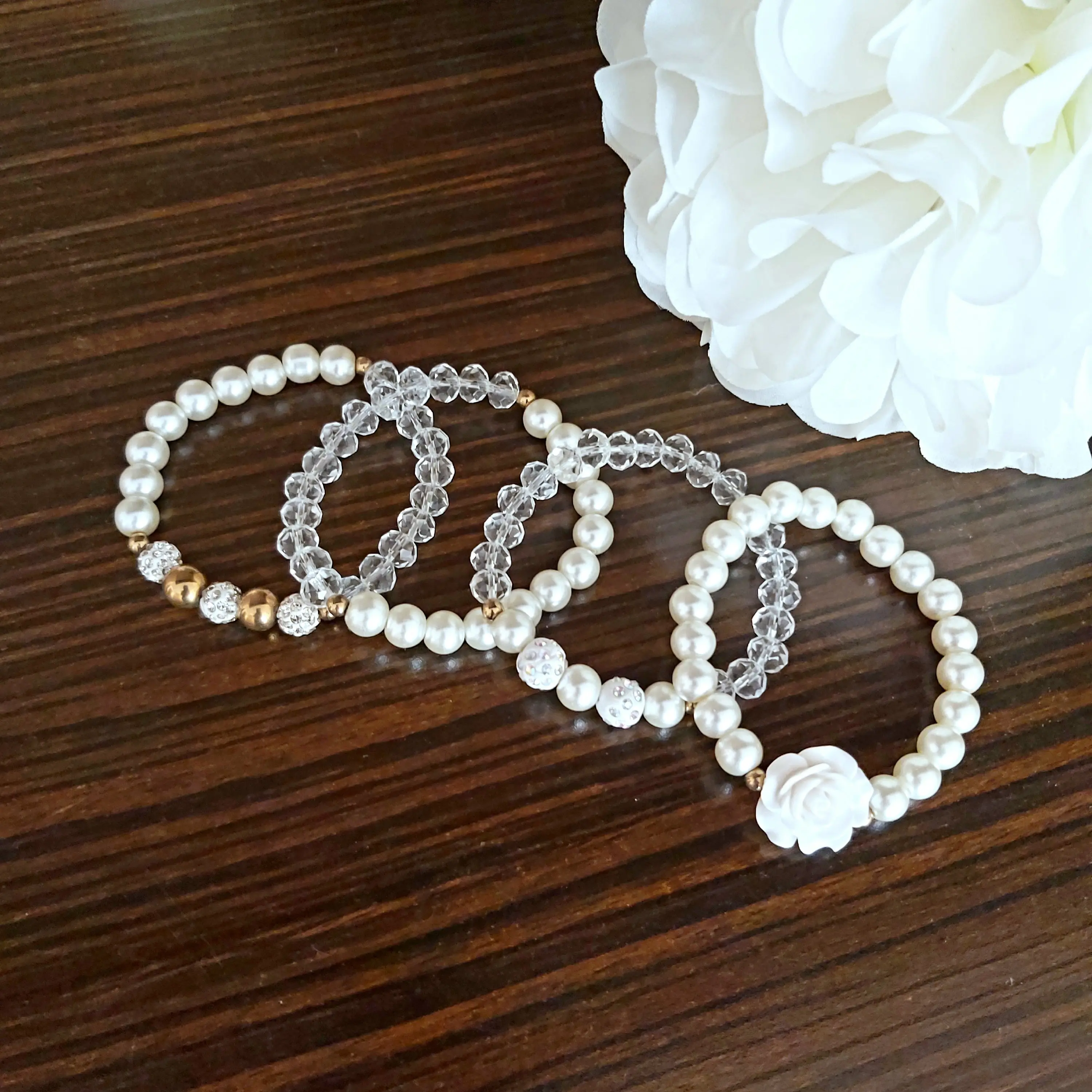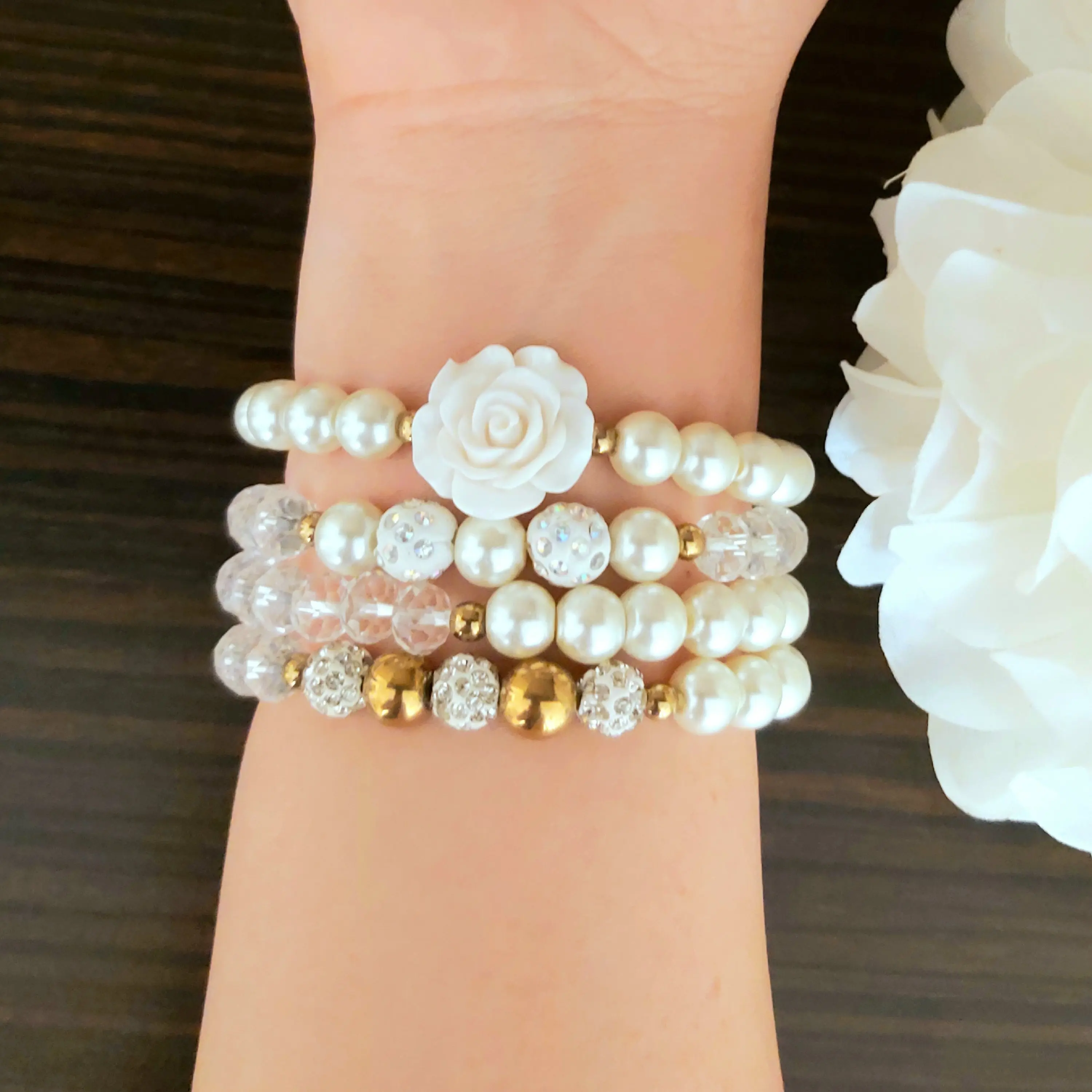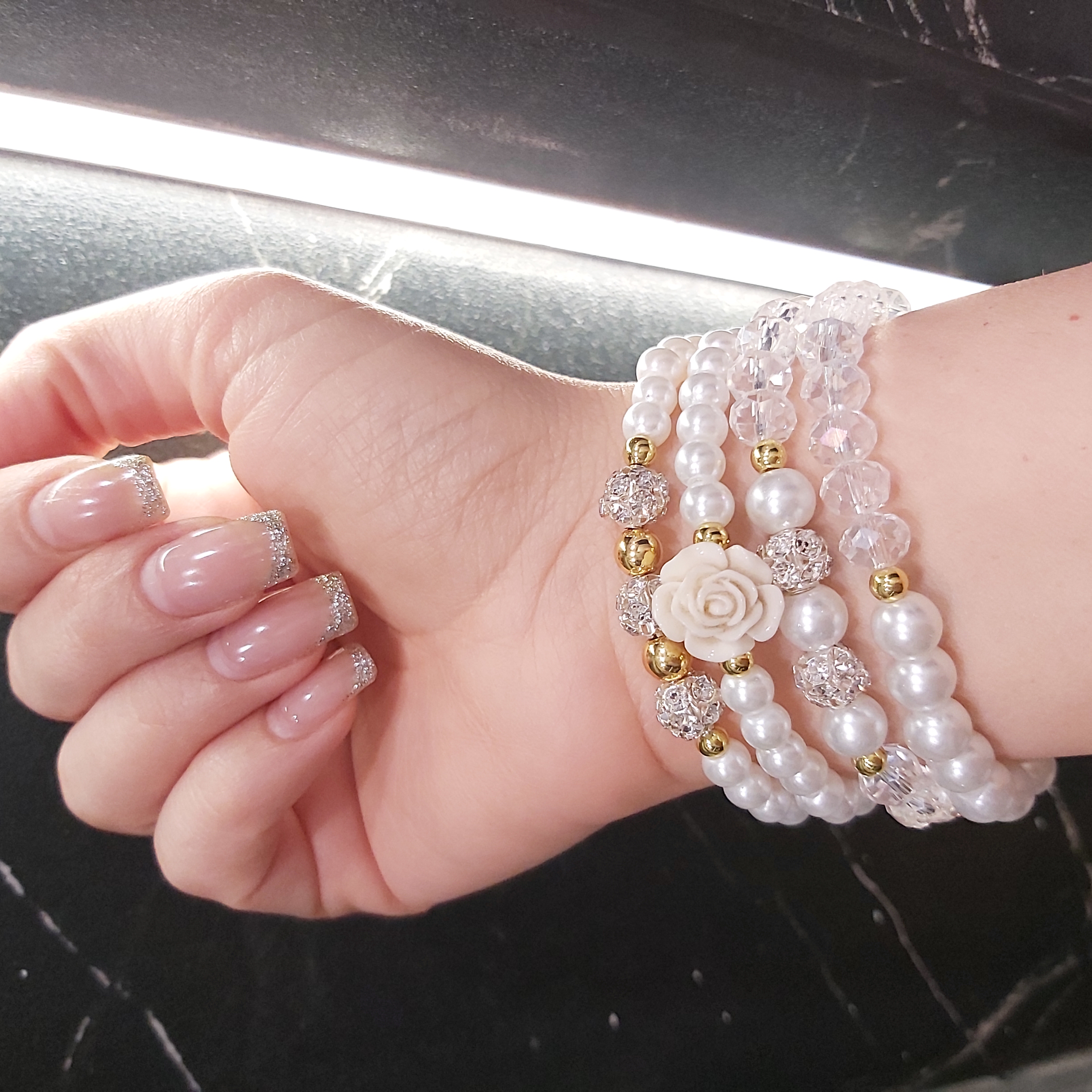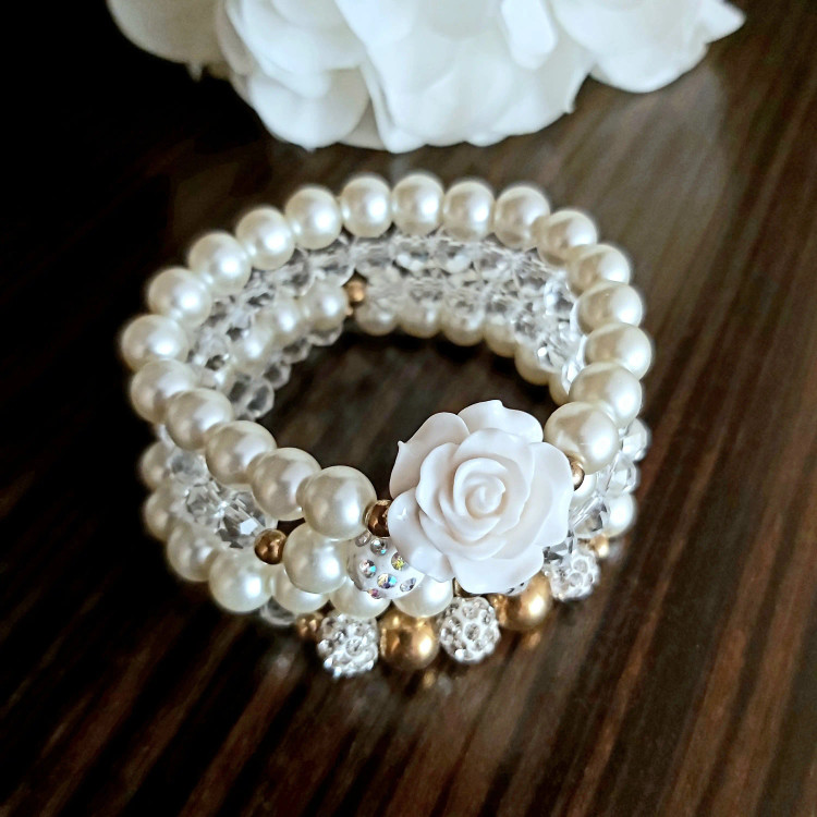 ست دستبند از چهار دستبند کشی که شامل مروارید سنگی و کریستال و گل سرامیکی و گوی نگین دار و حدید (هماتیت) طلایی گرد درست شده است که همگی رنگ ثابت هستن. مناسب هدیه دادن به عزیزانتان 🎁 مناسب خانم ها و دختران شیک پوش و لاکچری و خوش سلیقه که طرفدار زیورآلات و اکسسوری های مرواریدی و سفید هستن. فوق العاده رو دست هاتون زیبا هستش و بخاطر سفید بودن به همه رنگ لباس و مانتویی هم میاد و نمای قشنگی داره🤩