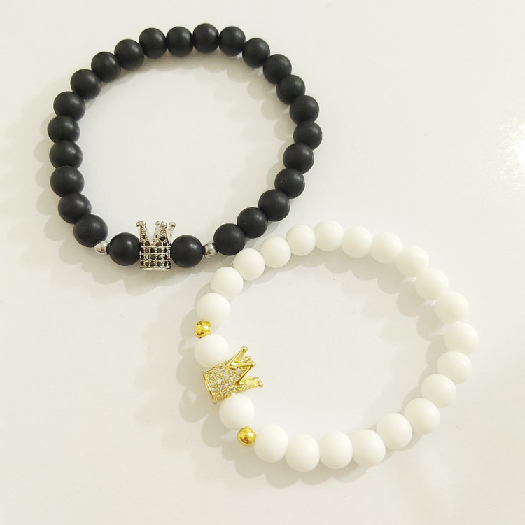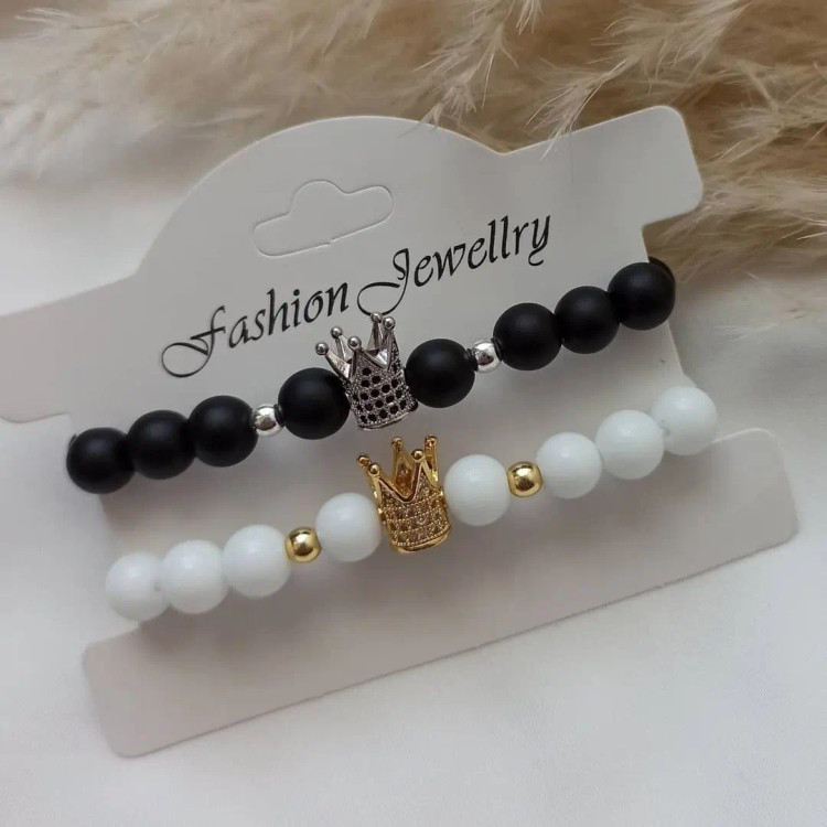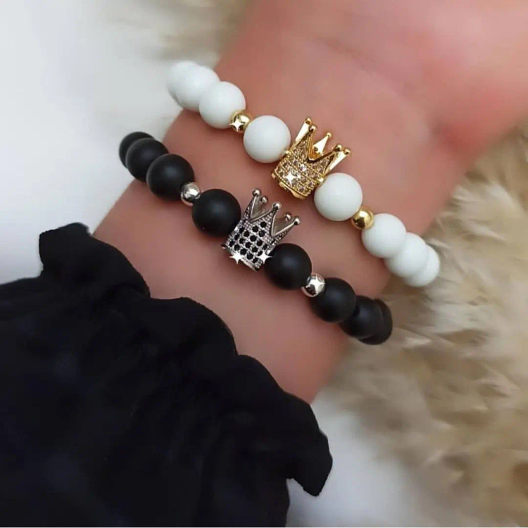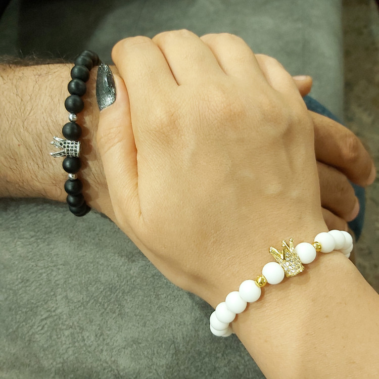 ست دستبند از دو دستبند کشی که یکی از اونیکس مشکی مات و تاج سوارسکی رنگ نقره ای با نگین های مشکی سنگ حدید گرد نقره ای و دستبند دیگری با اونیکس سفید و تاج سوارسکی طلایی با نگین های سفید و سنگ حدید گرد طلایی درست شده است که همگی رنگ ثابت میباشند 💯 ⚜️ مناسب جهت هدیه دادن به عزیزانتان 🎁 ⚜️ مناسب خانم ها و آقایان 🙋🏻♂️🙋🏻♀️ ⚜️ نیازی به موجودی گرفتن نیس و با خیال راحت خرید بزنید و بعد از ثبت سفارش حتماً اندازه دور مچ تان را با متر بصورت کیپ اندازه بگیرید و بهم اعلام کنید 💯 ⚜️ بخاطر ست بودن دستبند ها مناسب دوستان👭 و زوجین 👫🏻